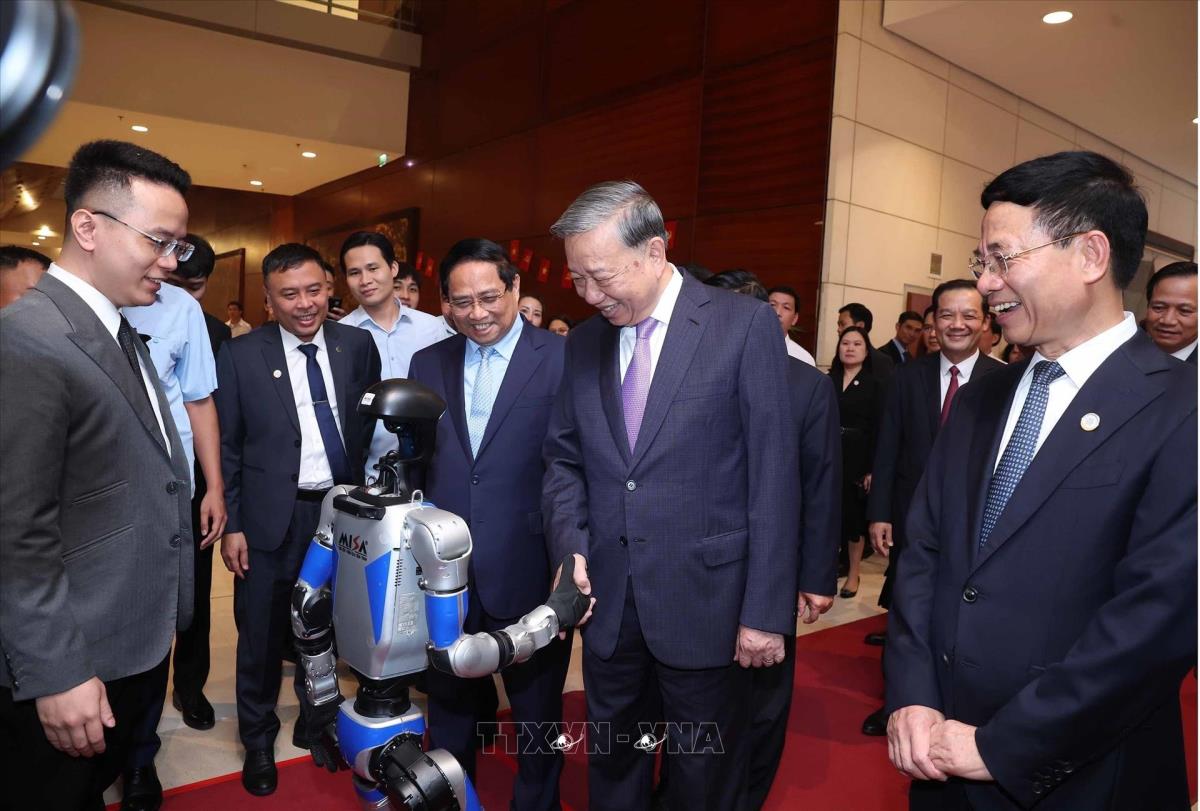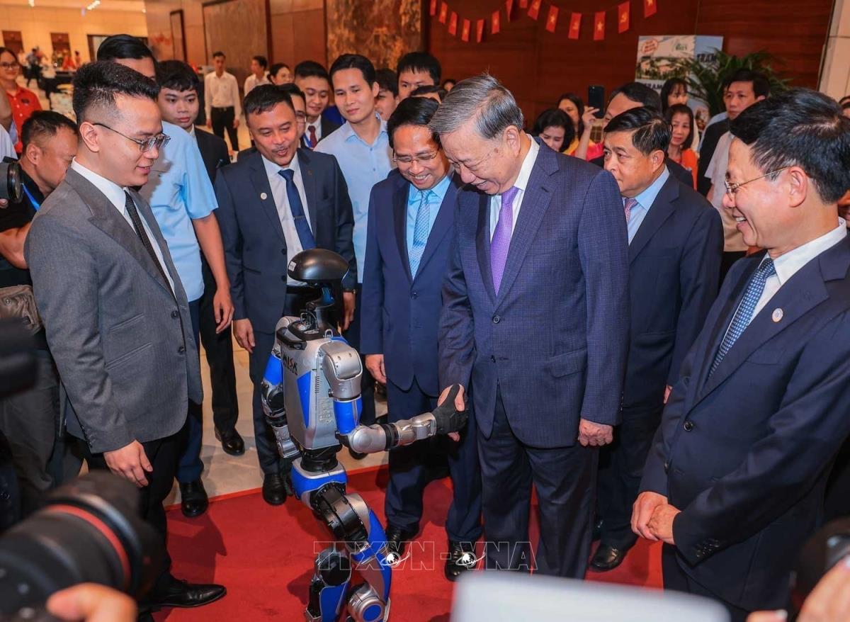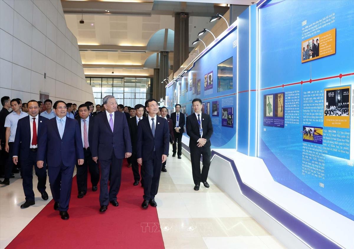 Tổng Bí thư Tô Lâm, Thủ tướng Phạm Minh Chính cùng các đại biểu tham quan triển lãm thành tựu khoa học và công nghệ. Ảnh: Thống Nhất - TTXVN