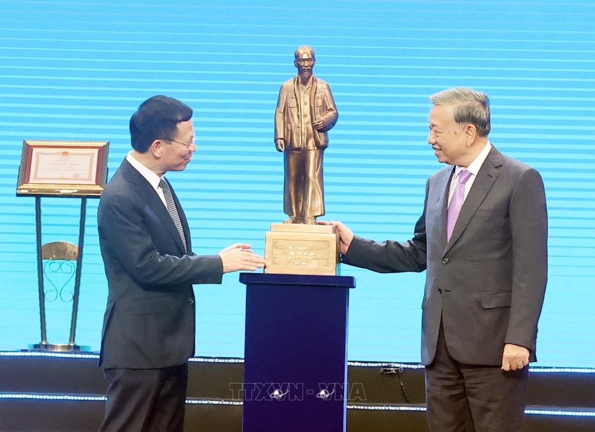 Tổng Bí thư Tô Lâm tặng bức tượng Chủ tịch Hồ Chí Minh cho Bộ Khoa học và Công nghệ. Ảnh: Thống Nhất - TTXVN