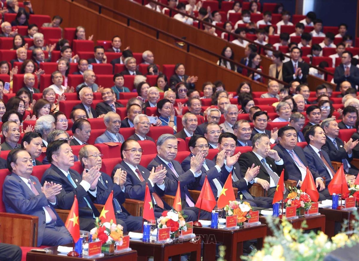 Tổng Bí thư Tô Lâm, Thủ tướng Phạm Minh Chính cùng các đồng chí Lãnh đạo, nguyên Lãnh đạo Đảng, Nhà nước dự buổi lễ. Ảnh: Thống Nhất - TTXVN