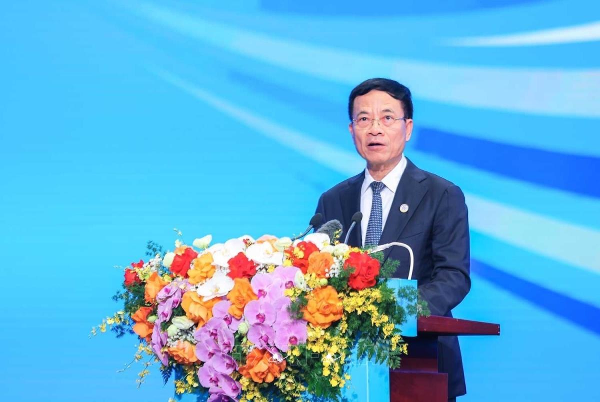 Bộ trưởng Bộ Khoa học và Công nghệ Nguyễn Mạnh Hùng đọc Diễn văn kỷ niệm (29/9/2025). Ảnh: Hoàng Hiếu - TTXVN