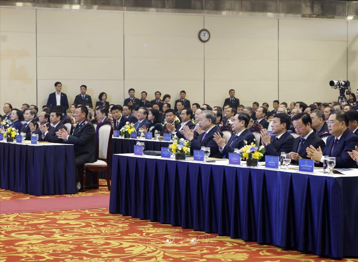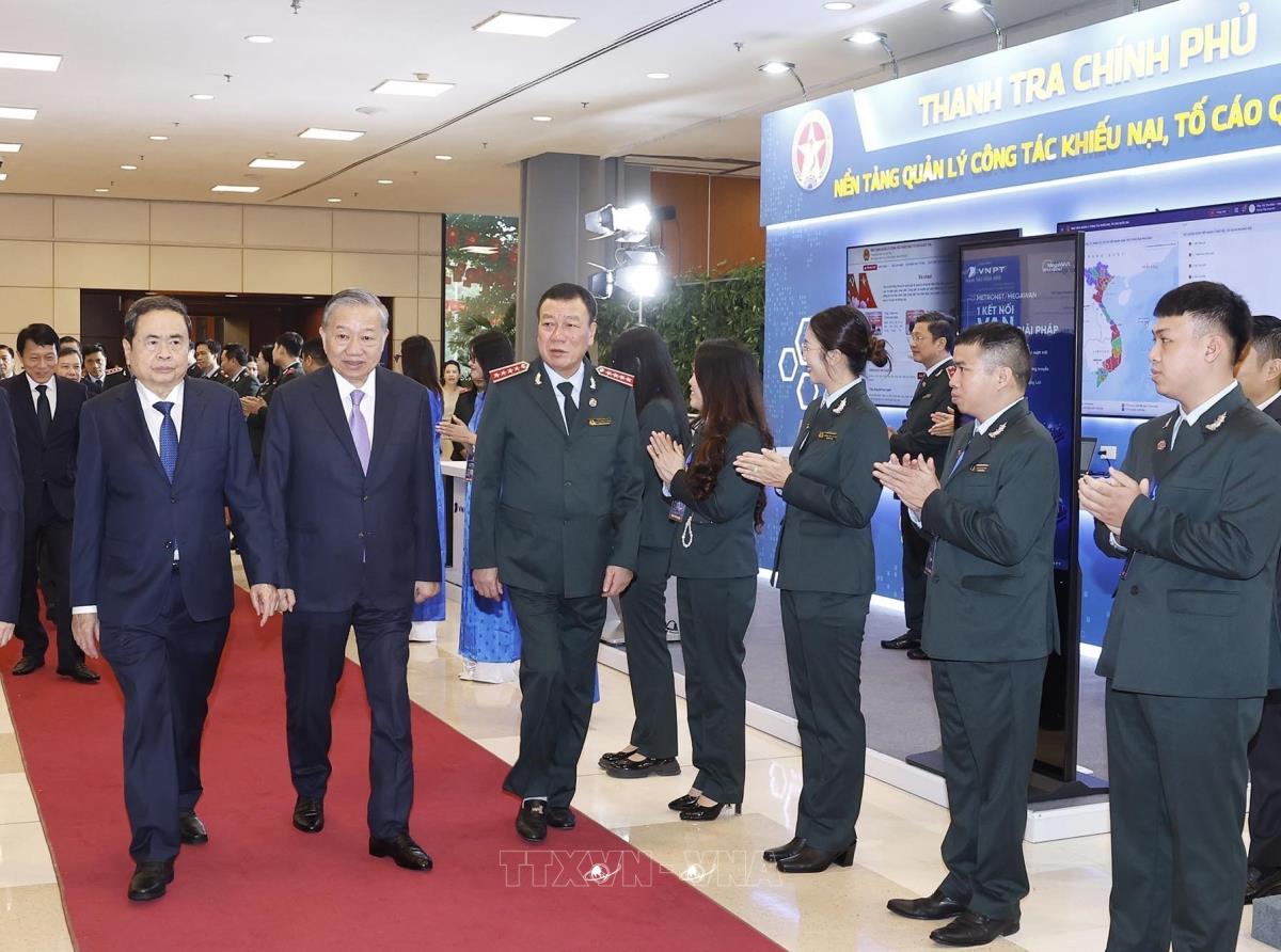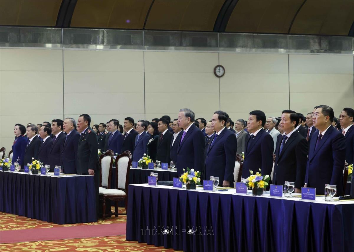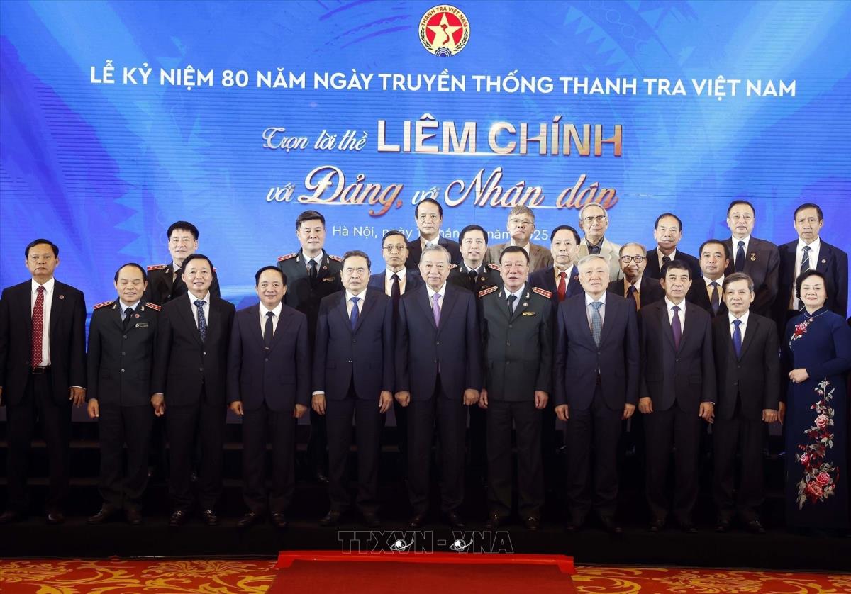 Tổng Bí thư Tô Lâm, Chủ tịch Quốc hội Trần Thanh Mẫn cùng các lãnh đạo Đảng, Nhà nước dự Lễ kỷ niệm 80 năm Ngày truyền thống Thanh tra Việt Nam. Ảnh: Thống Nhất - TTXVN