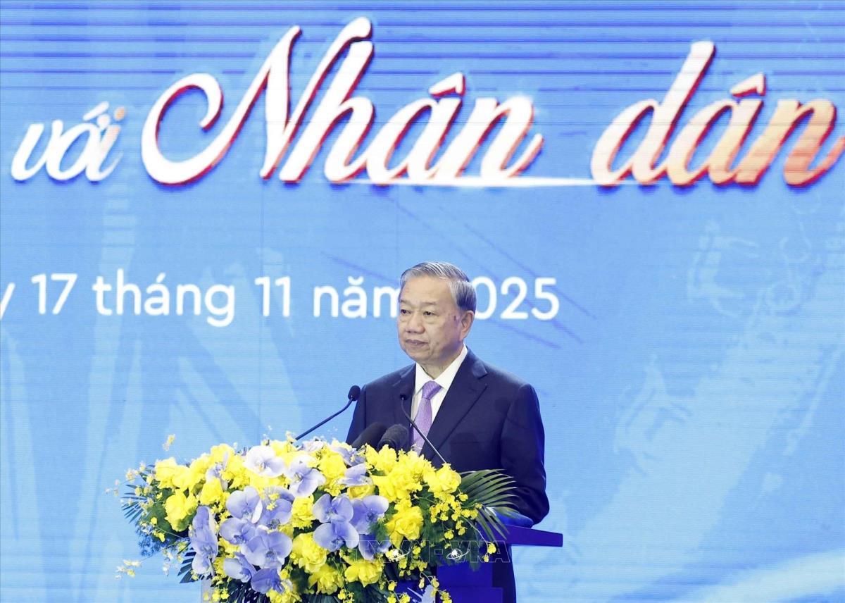 Tổng Bí thư Tô Lâm và các đại biểu tham dự lễ kỷ niệm (16/11/2025). Ảnh: Văn Điệp - TTXVN