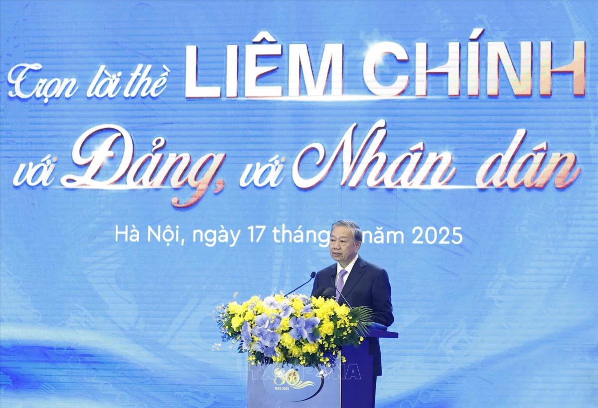 Tổng Bí thư Tô Lâm phát biểu tại Lễ kỷ niệm 80 năm Ngày truyền thống Thanh tra Việt Nam (23/11/1945 - 23/11/2025). Ảnh: Thống Nhất - TTXVN