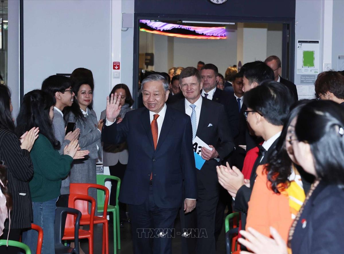 Tổng Bí thư Tô Lâm đến dự buổi gặp gỡ sinh viên Việt Nam đang theo học tại Helsinki (22/10/2025). Ảnh: Thống Nhất – TTXVN