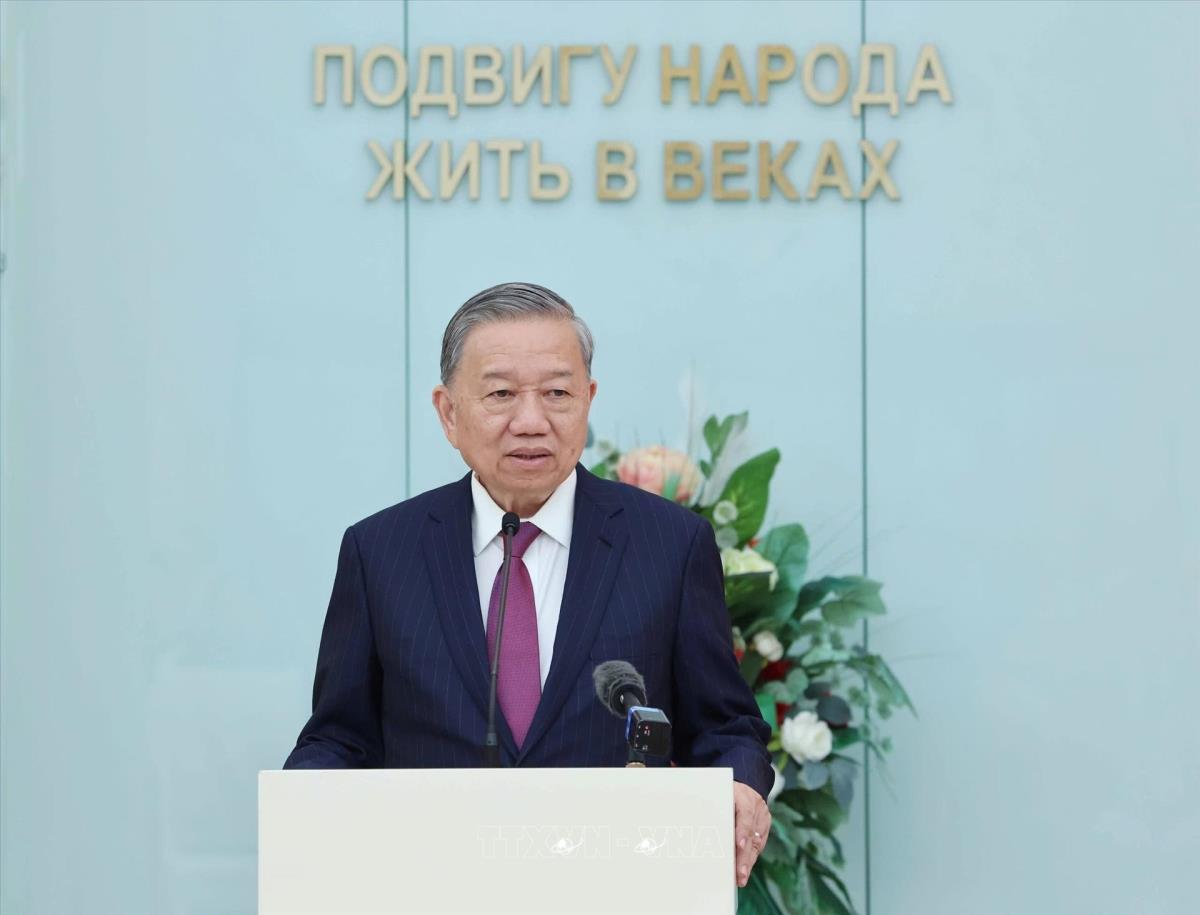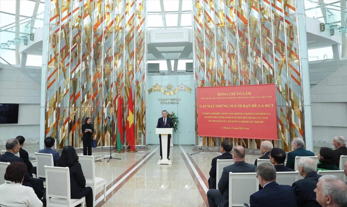 Tổng Bí thư Tô Lâm phát biểu tại buổi gặp mặt các cựu quân nhân, chuyên gia Belarus và những người bạn Belarus từng có đóng góp nổi bật cho Việt Nam (11/5/2025). Ảnh: Thống Nhất – TTXVN