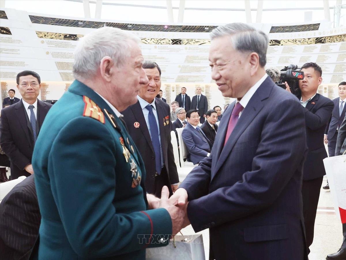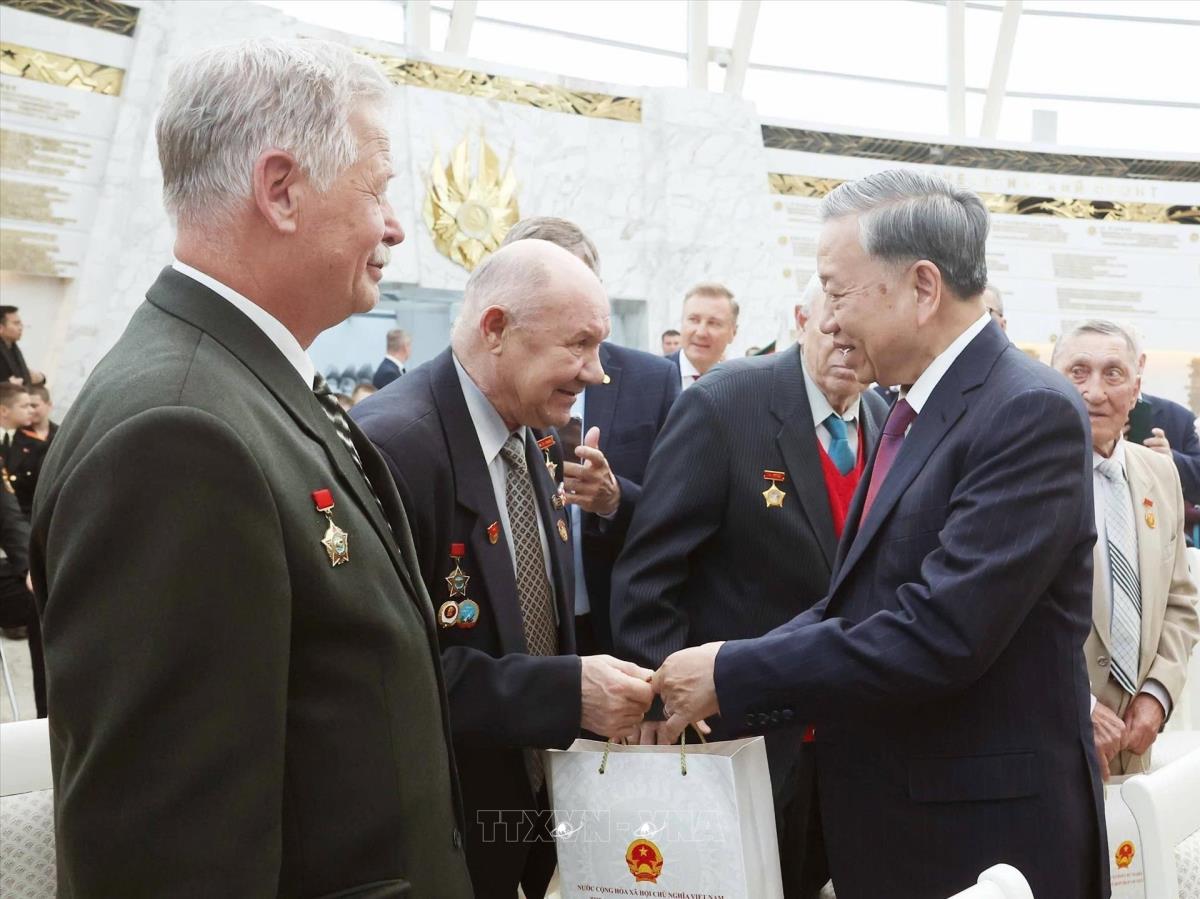 Tổng Bí thư Tô Lâm thăm hỏi, tặng quà cho các cựu quân nhân, chuyên gia Belarus và những người bạn Belarus từng có đóng góp nổi bật cho Việt Nam (11/5/2025). Ảnh: Thống Nhất – TTXVN