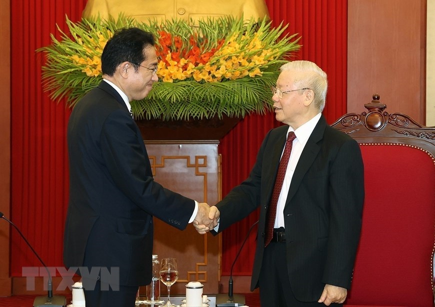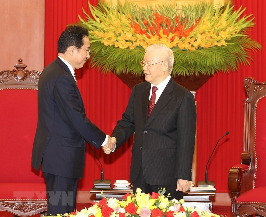 Tổng Bí thư Nguyễn Phú Trọng tiếp Thủ tướng Nhật Bản Kishida Fumio sang thăm chính thức Việt Nam. (Ảnh : Trí Dũng/TTXVN)