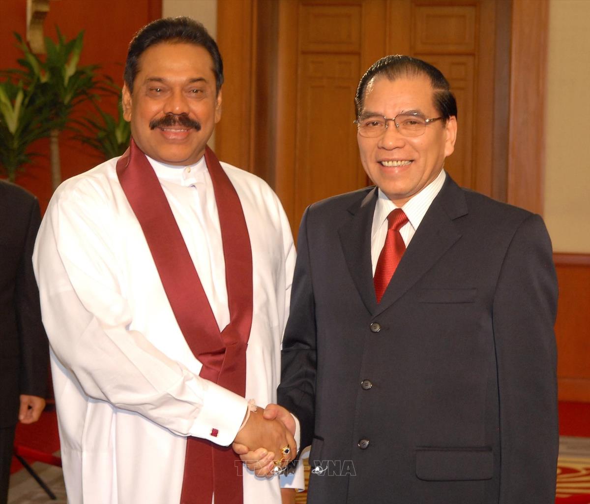Tổng Bí thư Nông Đức Mạnh tiếp ngài Ma-hin-đa Ra-gia-pắc-xơ, Tổng thống Cộng hoà Xã hội chủ nghĩa dân chủ Xri Lan-ca nhân chuyến thăm chính thức nước ta (22/10/2009). Ảnh : Nhan Sáng - TTXVN