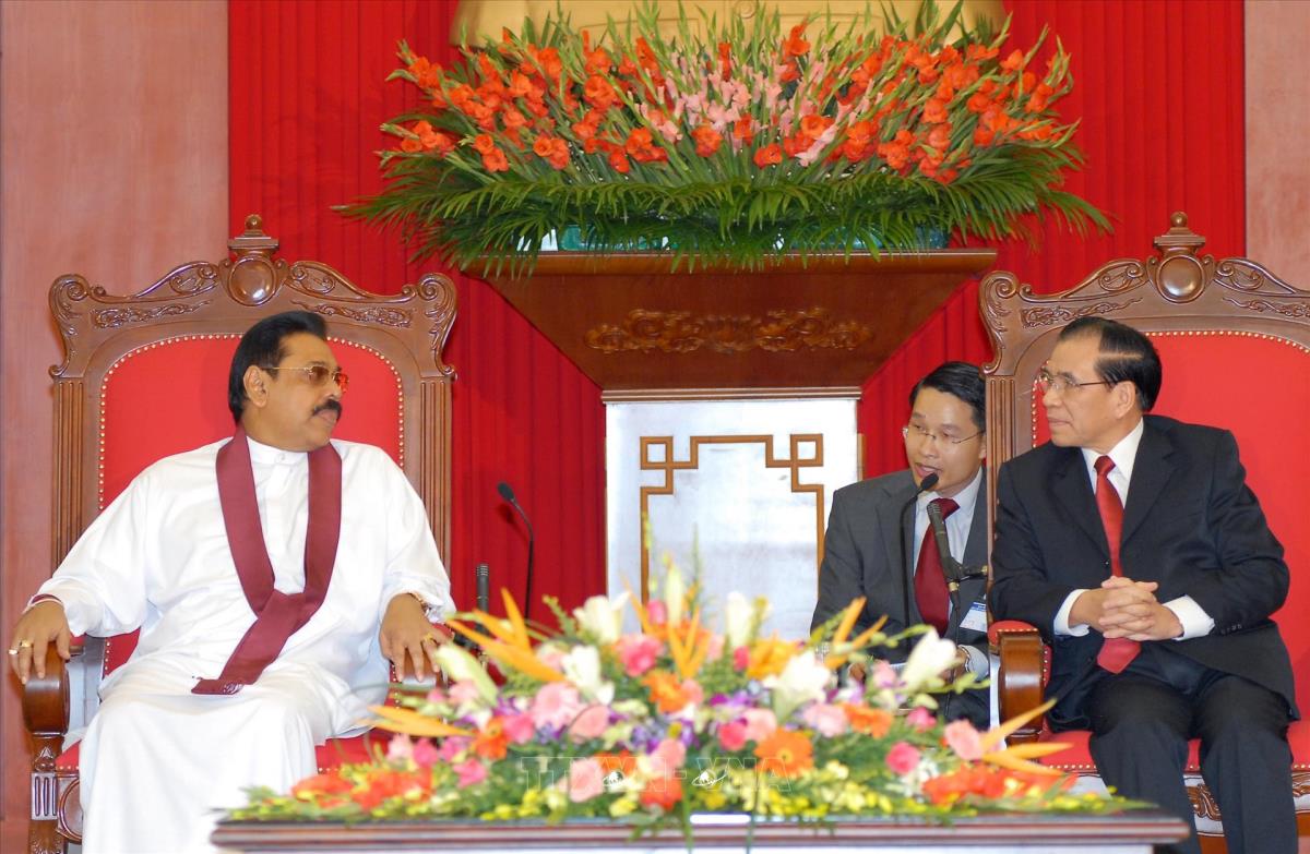 Tổng Bí thư Nông Đức Mạnh tiếp ngài Ma-hin-đa Ra-gia-pắc-xơ, Tổng thống Cộng hoà Xã hội chủ nghĩa dân chủ Xri Lan-ca nhân chuyến thăm chính thức nước ta (11/10/2009). Ảnh : Nhan Sáng - TTXVN