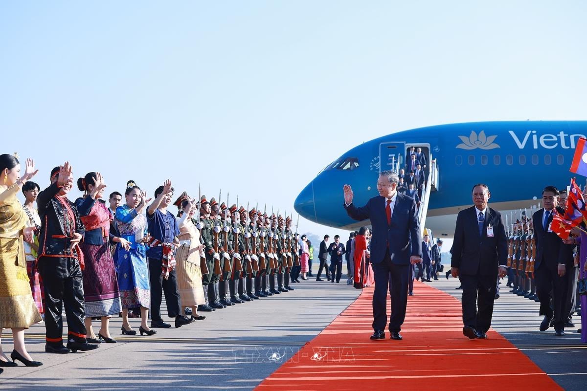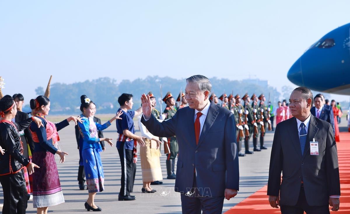Lễ đón Tổng Bí thư Tô Lâm cùng Đoàn đại biểu cấp cao Việt Nam sang thăm cấp Nhà nước tới Lào (5/2/2026). Ảnh: Dương Giang-TTXVN