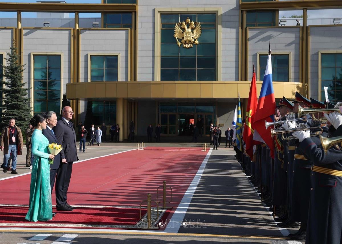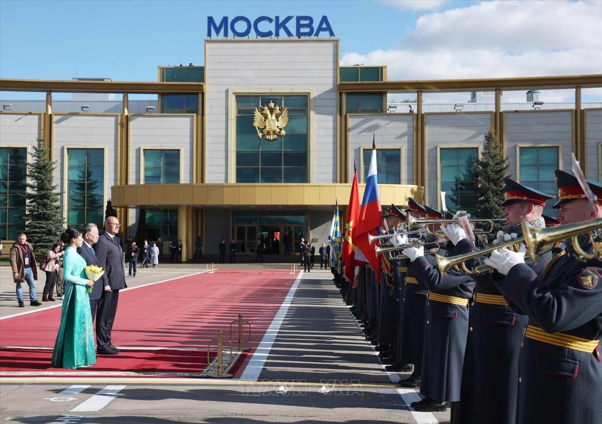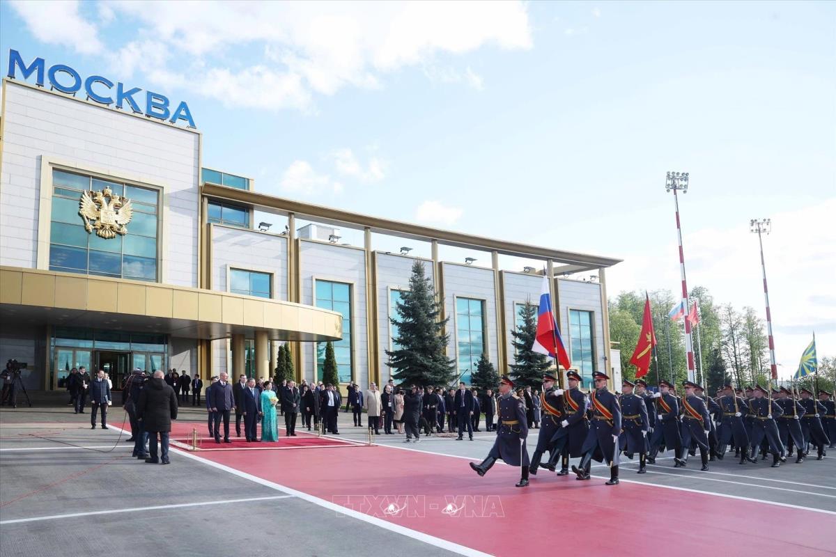 Lễ đón chính thức Tổng Bí thư Tô Lâm và Phu nhân tại sân bay Vnukovo 2, thủ đô Moskva (8/5/2025). Ảnh: Thống Nhất – TTXVN
