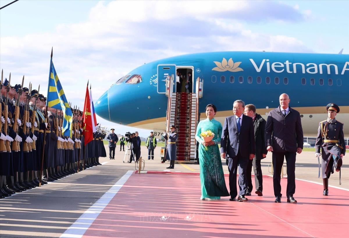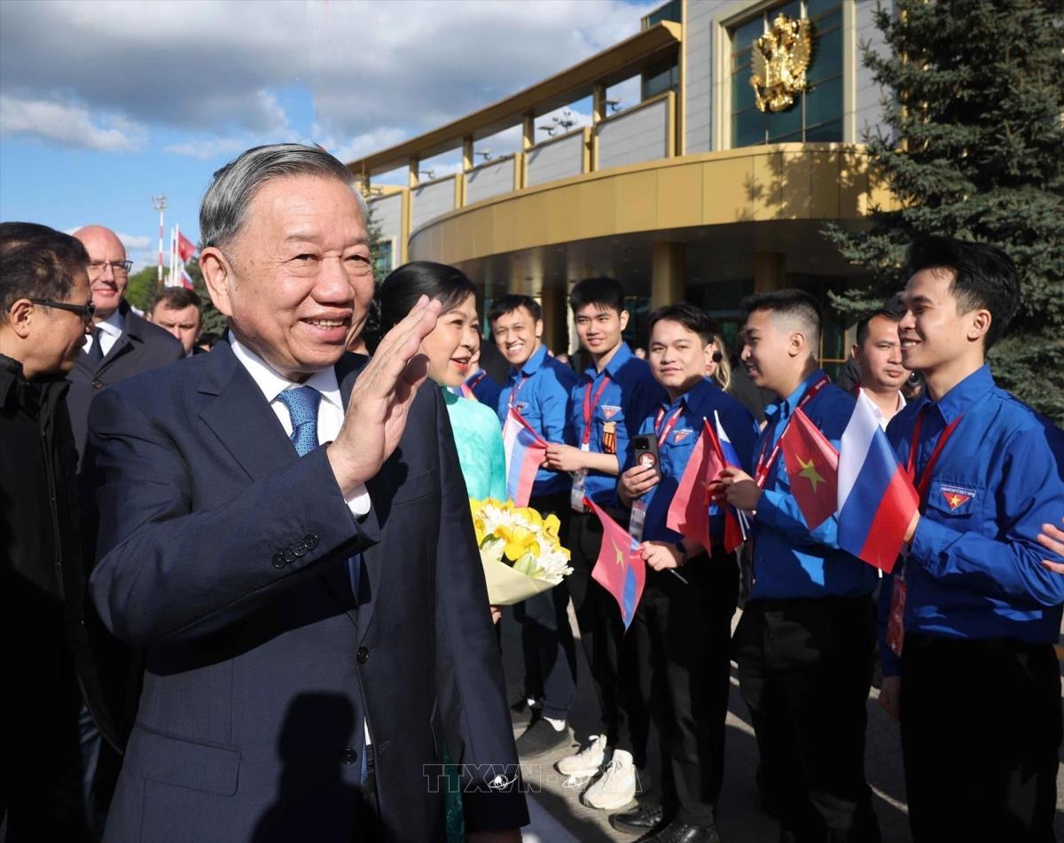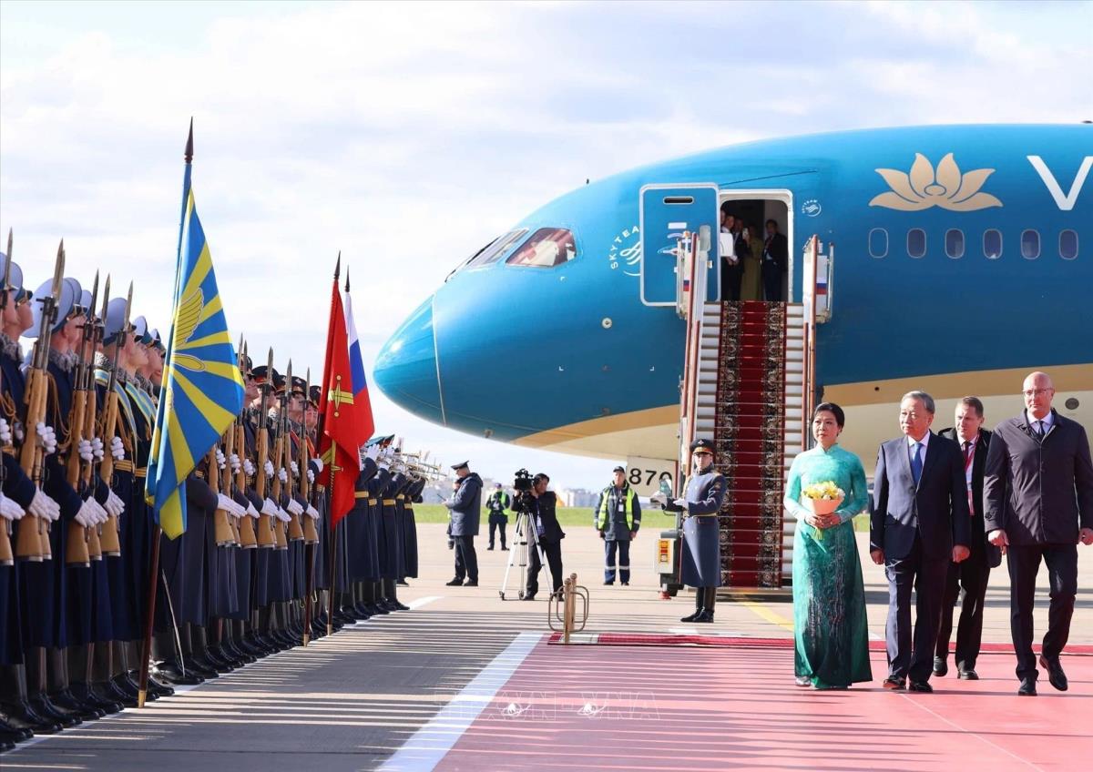 Hà Nội (TTXVN 8/5/2025) Chiều 8/5/2025, giờ địa phương (tối cùng ngày, giờ Hà Nội), Tổng Bí thư Tô Lâm và Phu nhân cùng đoàn đại biểu cấp cao Việt Nam đến thủ đô Moskva, bắt đầu chuyến thăm chính thức Liên bang Nga và dự Lễ kỷ niệm 80 năm Ngày Chiến thắng trong chiến tranh Vệ quốc vĩ đại, từ ngày 8 đến 11/5/2025 theo lời mời của Tổng thống Vladimir Putin.