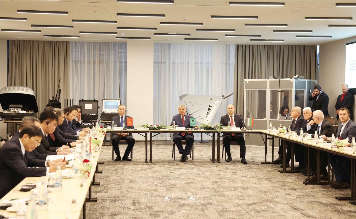 Tổng thống Bulgaria Rumen Radev đón Tổng Bí thư Tô Lâm thăm doanh nghiệp quốc phòng Samel 90 (24/10/2025). Ảnh: Thống Nhất – TTXVN