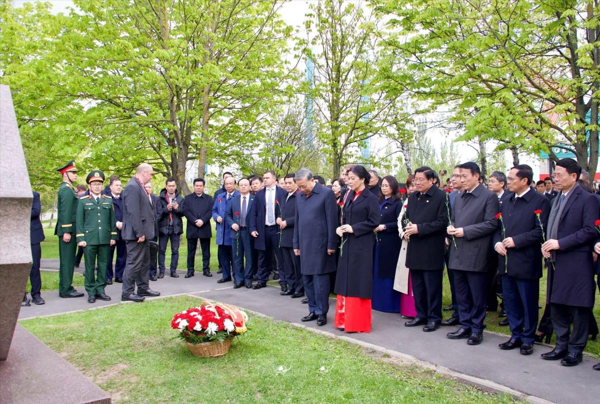 Tổng Bí thư Tô Lâm và Phu nhân cùng đoàn đại biểu cấp cao Việt Nam đặt hoa tại tấm biển lưu danh Tổng Bí thư Lê Duẩn ở Moskva (10/5/2025). Ảnh: TTXVN phát