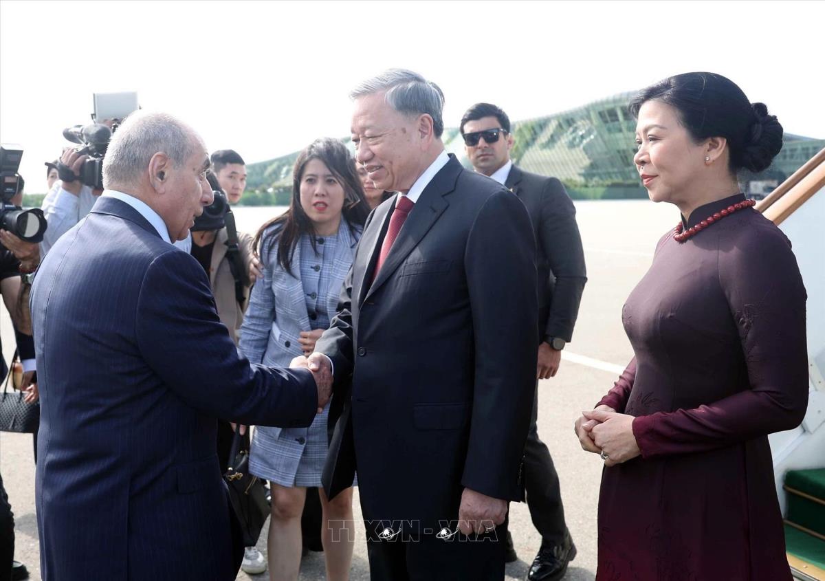 Tổng Bí thư Tô Lâm và Phu nhân đến Sân bay quốc tế Heydar Aliyev, thủ đô Baku (7/5/2025). Ảnh: Thống Nhất – TTXVN