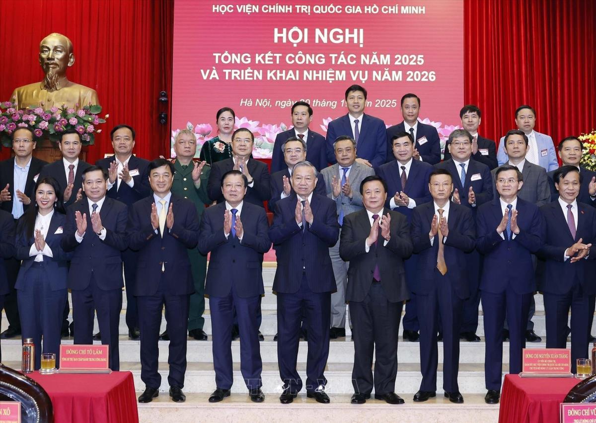 Phát biểu chỉ đạo Hội nghị, Tổng Bí thư Tô Lâm đánh giá cao và trân trọng ghi nhận những nỗ lực to lớn, tinh thần trách nhiệm cao, sự cống hiến bền bỉ và đầy tâm huyết của toàn hệ thống Học viện trong năm 2025 – một năm có ý nghĩa đặc biệt quan trọng trong tổng kết 40 năm Đổi mới, chuẩn bị Đại hội đại biểu toàn quốc lần thứ XIV của Đảng và định hình những nền tảng chiến lược cho kỷ nguyên phát triển mới của đất nước; nhấn mạnh không chỉ là tổng kết một năm công tác, mà còn là dịp rà soát, hiệu chỉnh tư duy, chuẩn bị về trí tuệ, đội ngũ và phương pháp hành động cho chặng đường phát triển sắp tới.