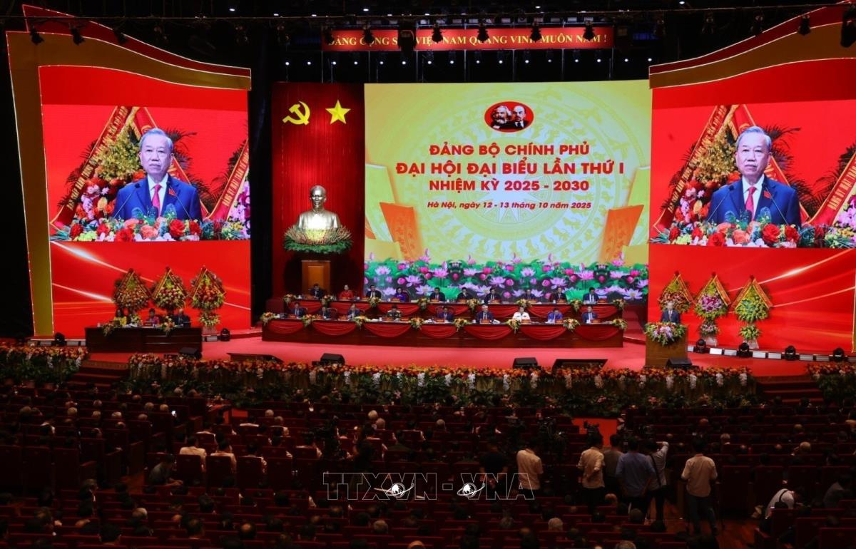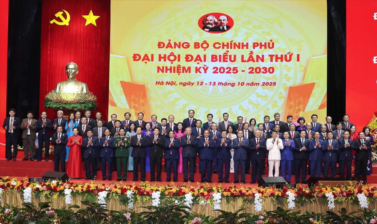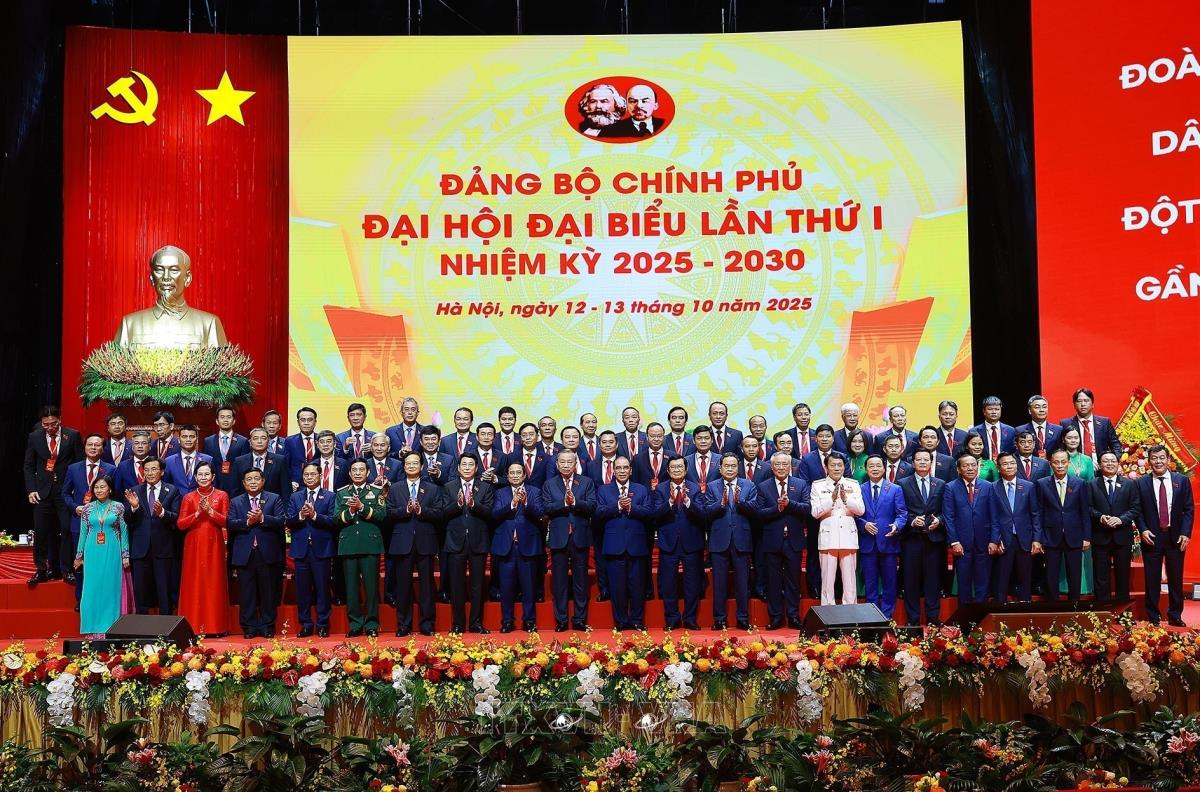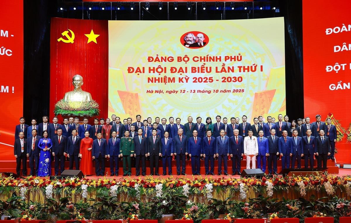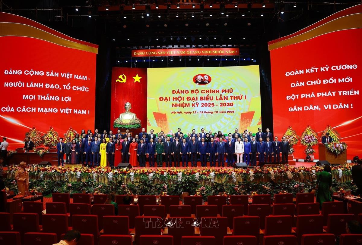 Tổng Bí thư Tô Lâm cùng các đồng chí lãnh đạo Đảng và Nhà nước với các đại biểu dự Đại hội đại biểu Đảng bộ Chính phủ lần thứ nhất (13/10/2025). Ảnh: Dương Giang-TTXVN