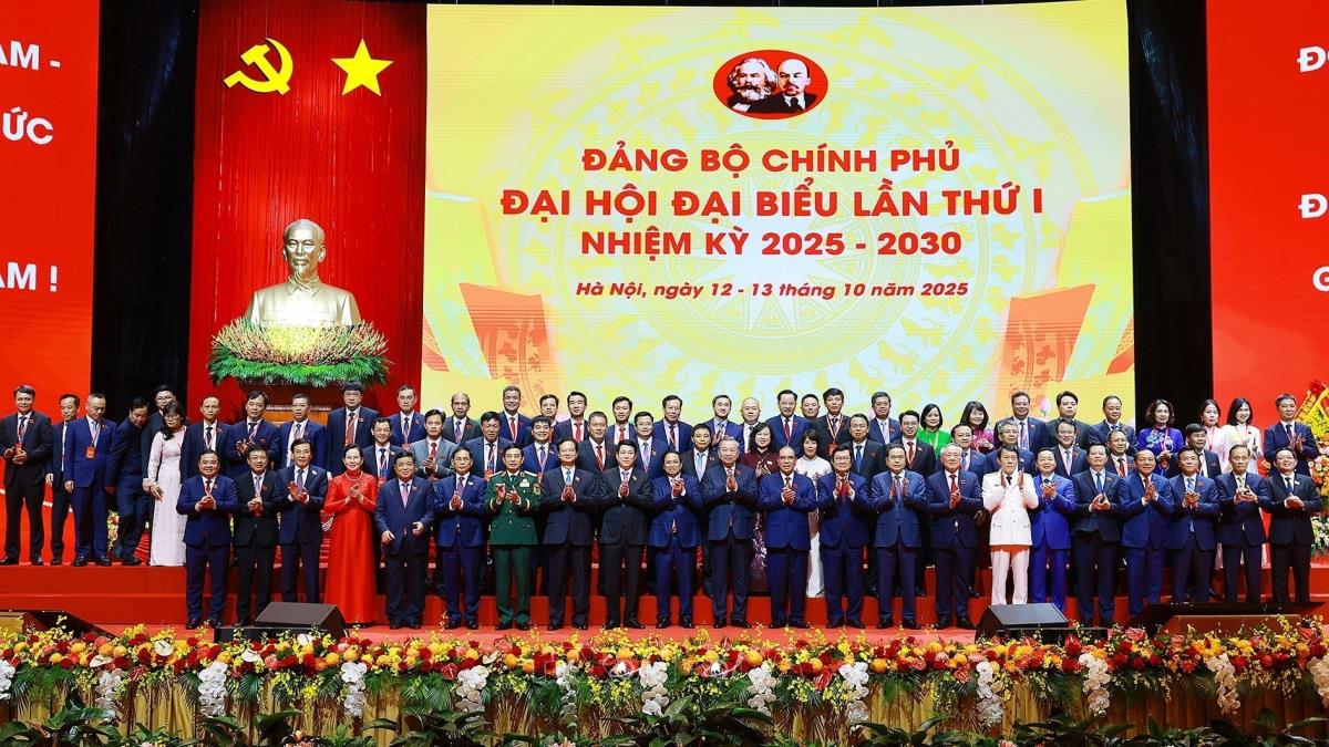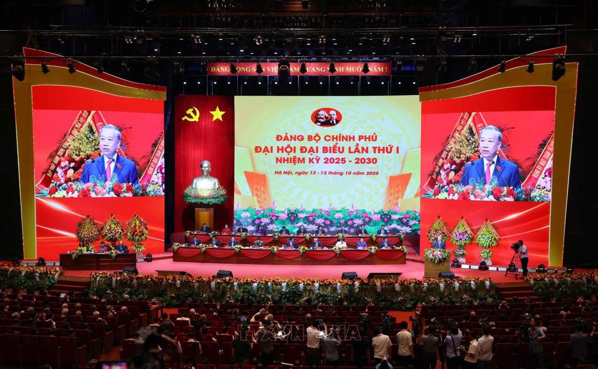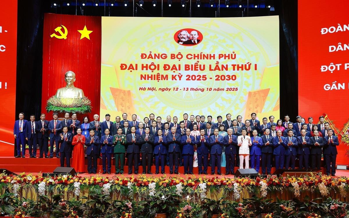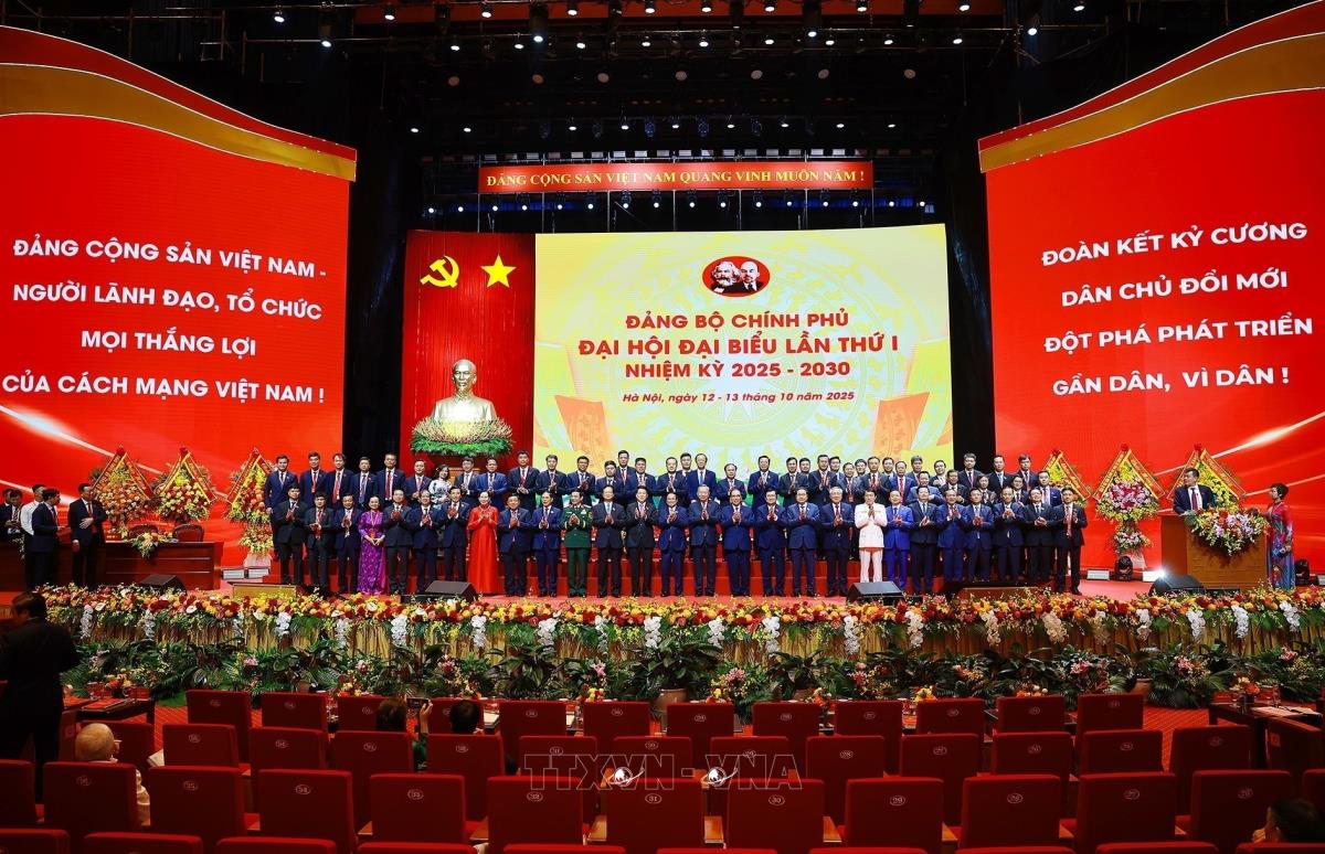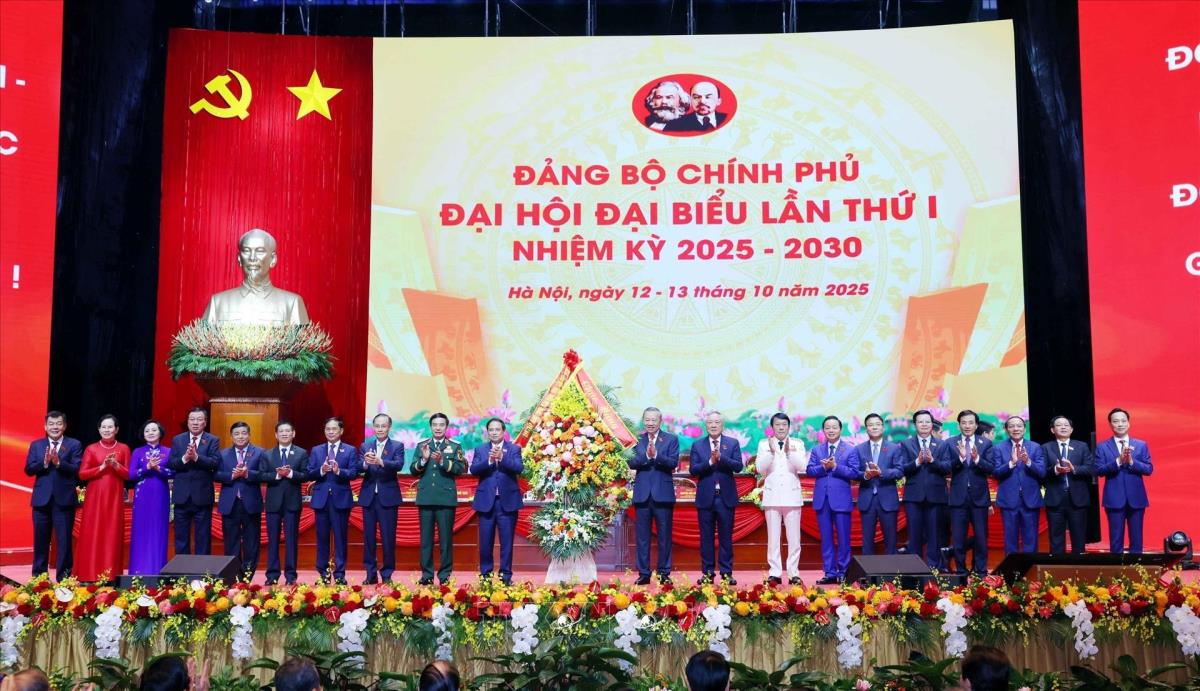 Tổng Bí thư Tô Lâm cùng các đồng chí lãnh đạo Đảng và Nhà nước với các đại biểu dự Đại hội đại biểu Đảng bộ Chính phủ lần thứ nhất (13/10/2025). Ảnh: Dương Giang-TTXVN