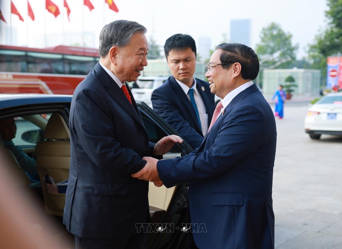 Thủ tướng Phạm Minh Chính đón Tổng Bí thư Tô Lâm đến dự Đại hội đại biểu Đảng bộ Chính phủ lần thứ I (13/10/2025). Ảnh: Dương Giang-TTXVN