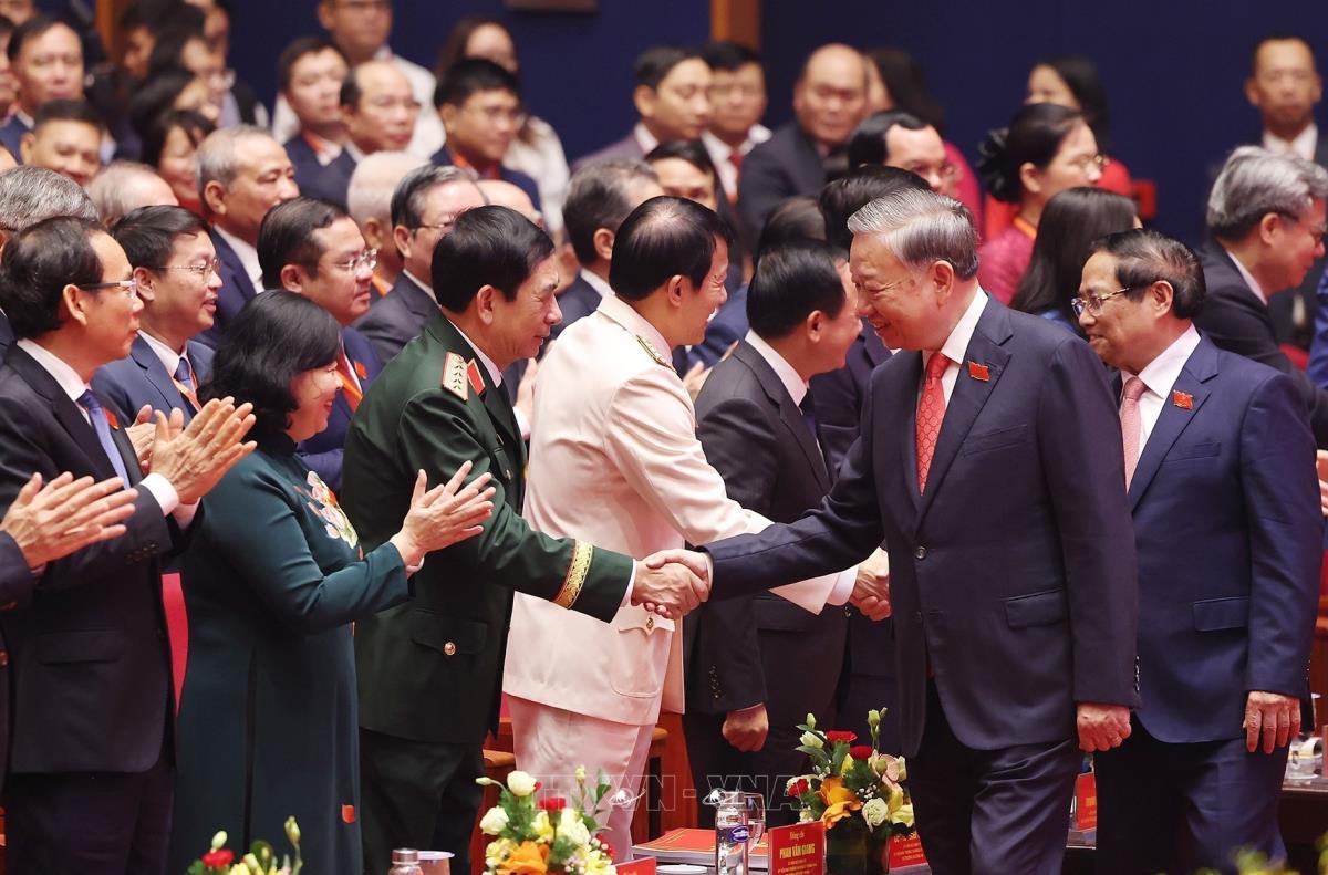 Tổng Bí thư Tô Lâm chúc mừng Đại hội đại biểu Đảng bộ Chính phủ lần thứ nhất (13/10/2025). Ảnh: Thống Nhất-TTXVN