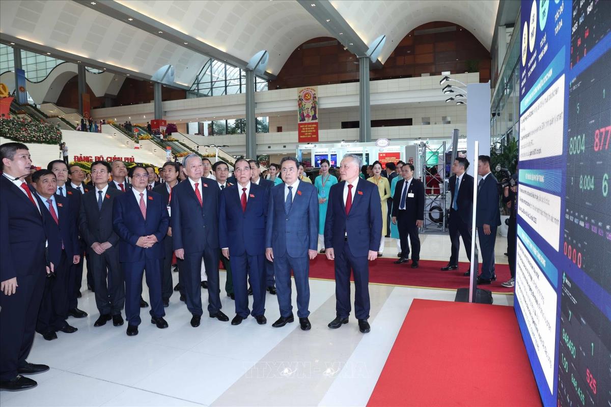 Lãnh đạo Đảng, Nhà nước tham quan triển lãm thành tựu phát triển khoa học, công nghệ và đổi mới sáng tạo và chuyển đổi số của khối Chính phủ (13/10/2025). Ảnh: Dương Giang-TTXVN