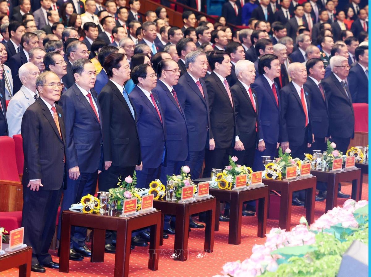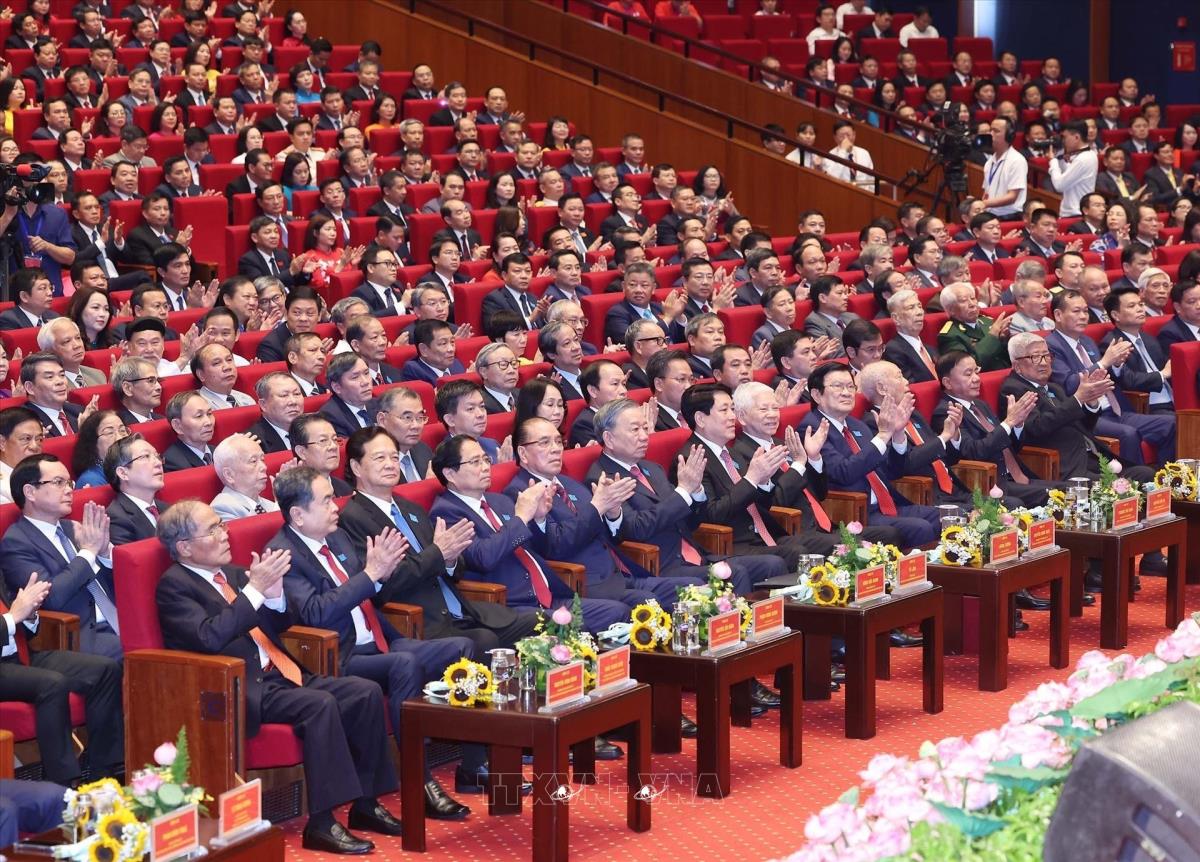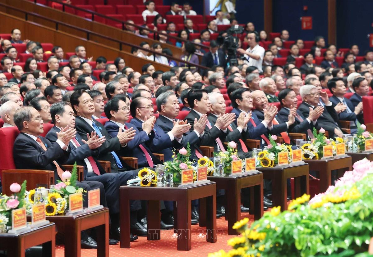 Tổng Bí thư Tô Lâm cùng các đồng chí Lãnh đạo, nguyên Lãnh đạo Đảng, Nhà nước dự Đại hội (16/10/2025). Ảnh: Thống Nhất-TTXVN