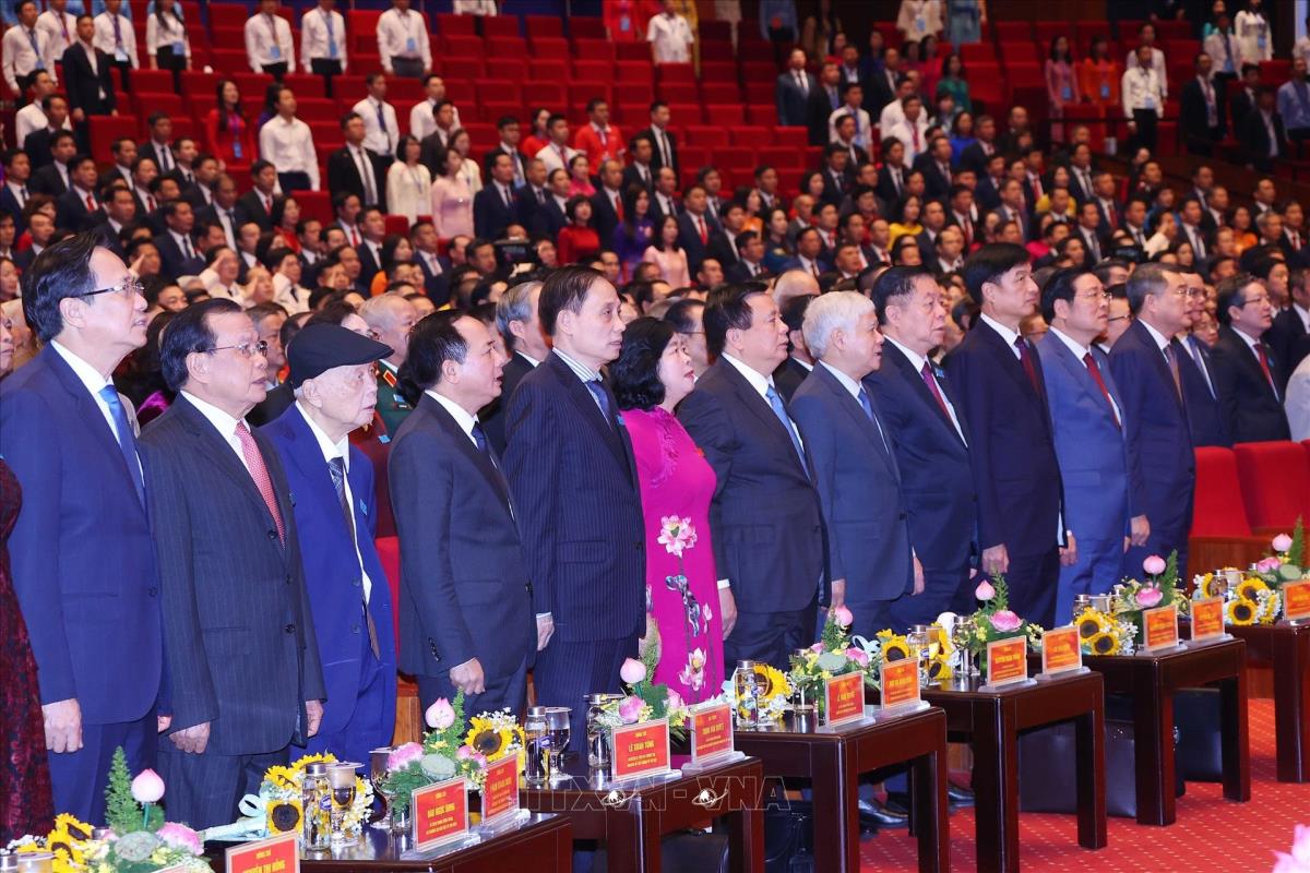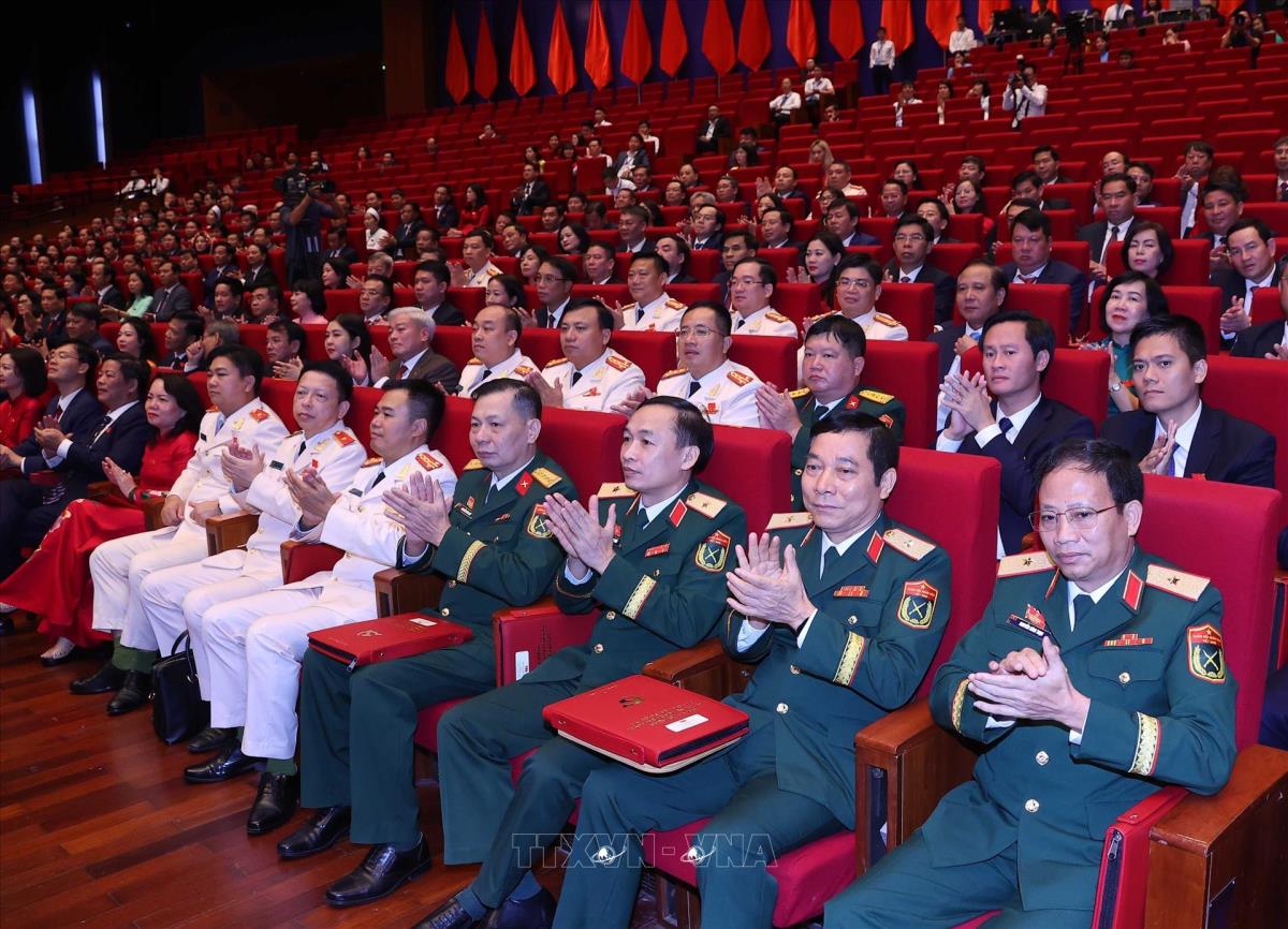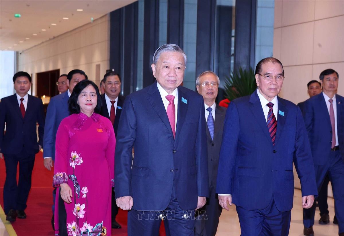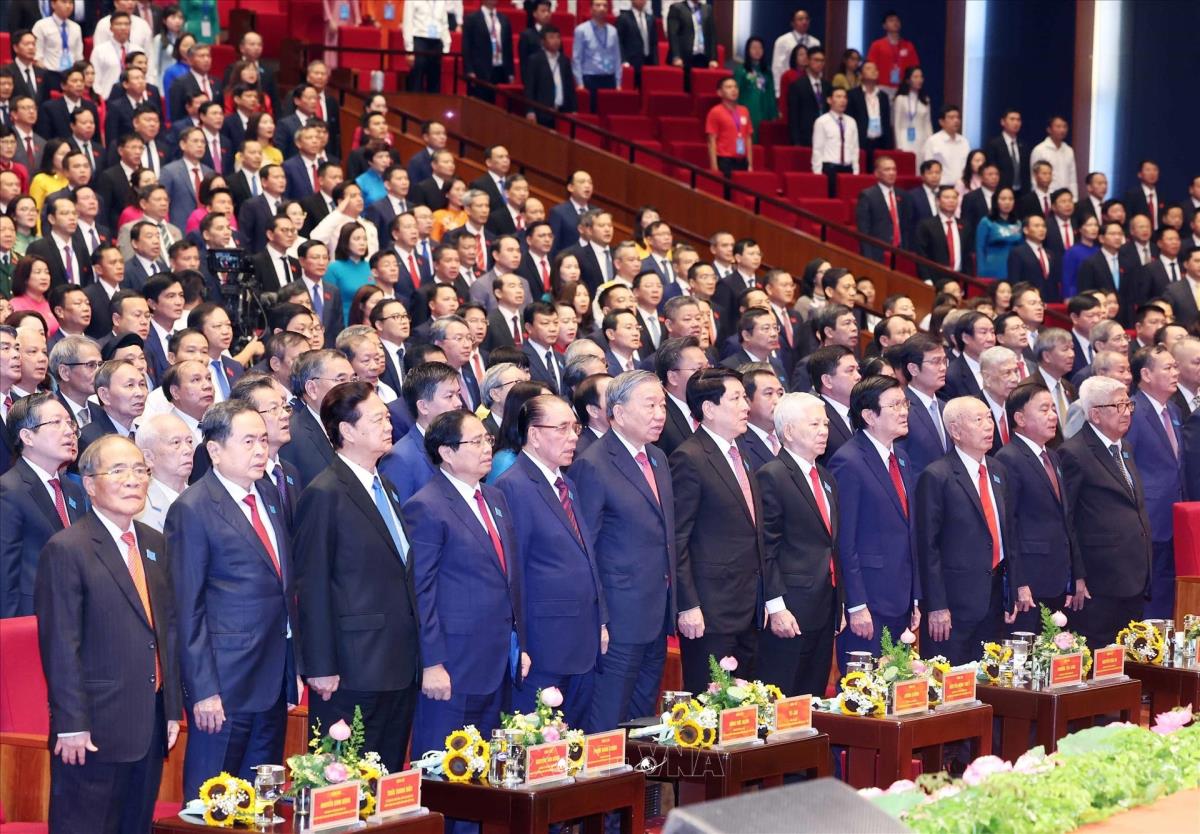 Tổng Bí thư Tô Lâm cùng các đồng chí Lãnh đạo, nguyên Lãnh đạo Đảng, Nhà nước dự Đại hội (16/10/2025). Ảnh: Thống Nhất-TTXVN