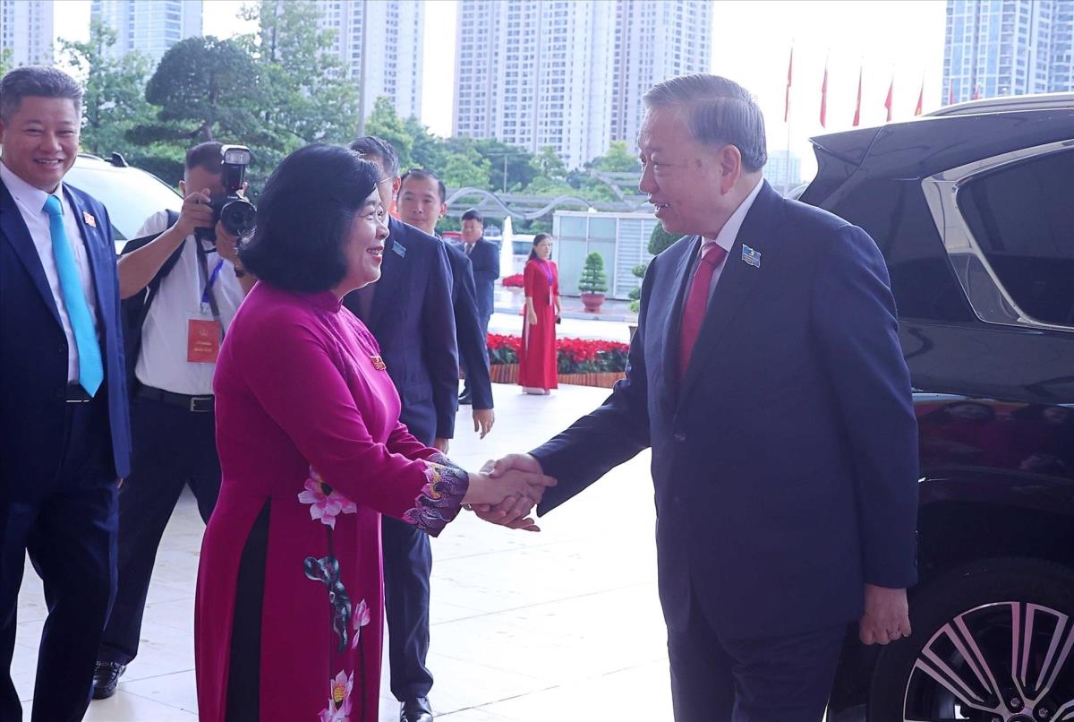 Đồng chí Bùi Thị Minh Hoài, Ủy viên Bộ Chính trị, Bí thư Thành ủy Hà Nội đón Tổng Bí thư Tô Lâm đến dự Đại hội đại biểu Đảng bộ thành phố Hà Nội lần thứ 18, nhiệm kỳ 2025-2030 (16/10/2025). Ảnh: Văn Điệp – TTXVN