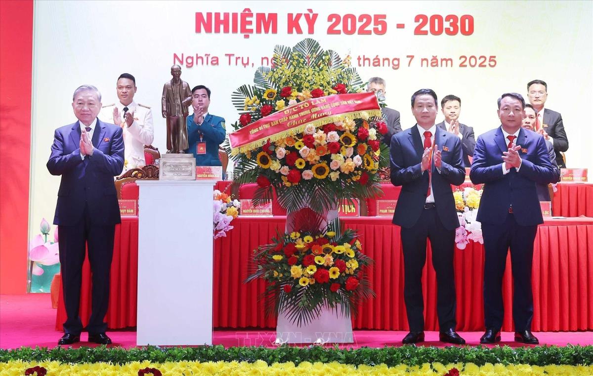 Tổng Bí thư Tô Lâm tặng lẵng hoa chúc mừng Đại hội đại biểu Đảng bộ xã Nghĩa Trụ nhiệm kỳ 2025 - 2030 (14/7/2025). Ảnh: Thống Nhất – TTXVN