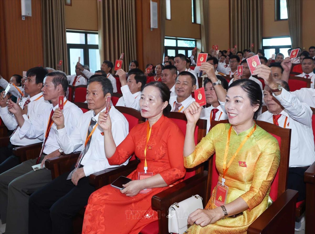 Các đại biểu biểu quyết thông qua dự thảo Nghị quyết đại hội (14/7/2025). Ảnh: Thống Nhất – TTXVN