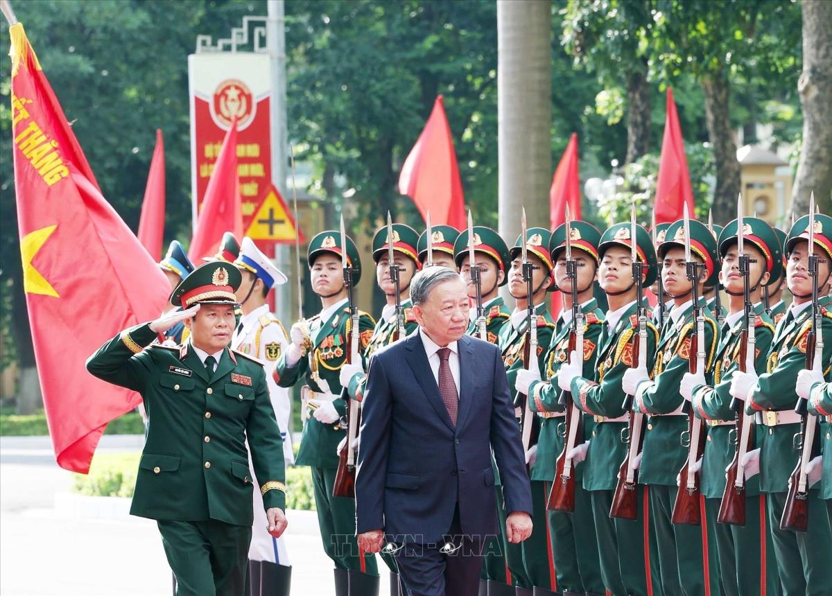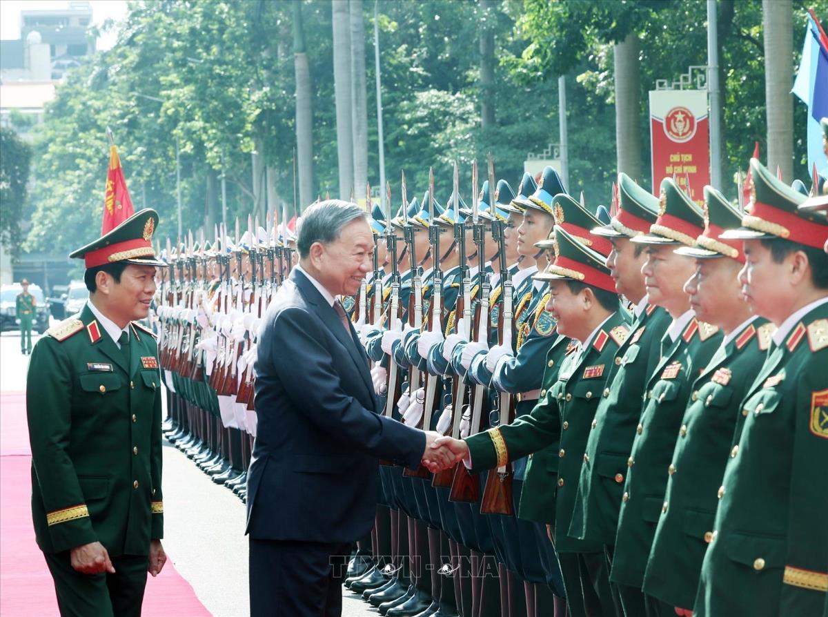 Lễ đón Tổng Bí thư Tô Lâm đến dự Lễ kỷ niệm 80 năm Ngày truyền thống Bộ Tổng Tham mưu Quân đội nhân dân Việt Nam. Ảnh: Thống Nhất - TTXVN