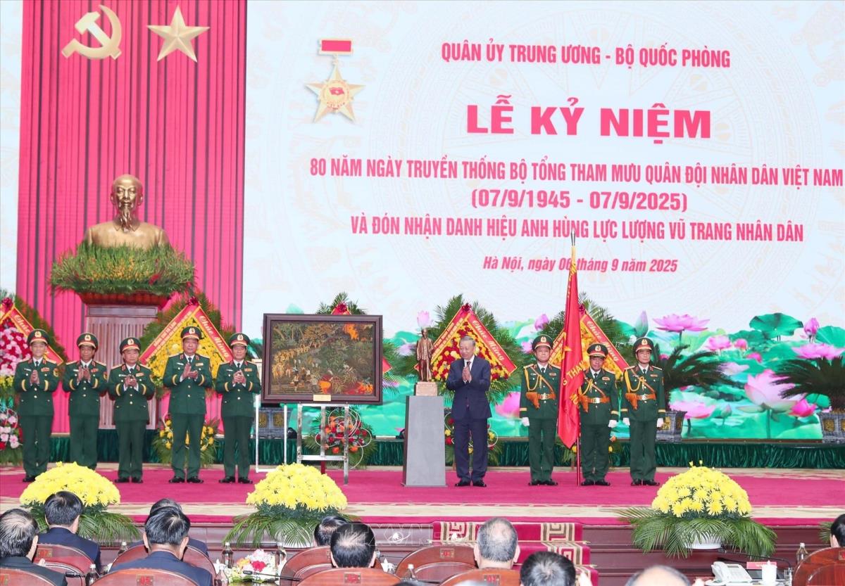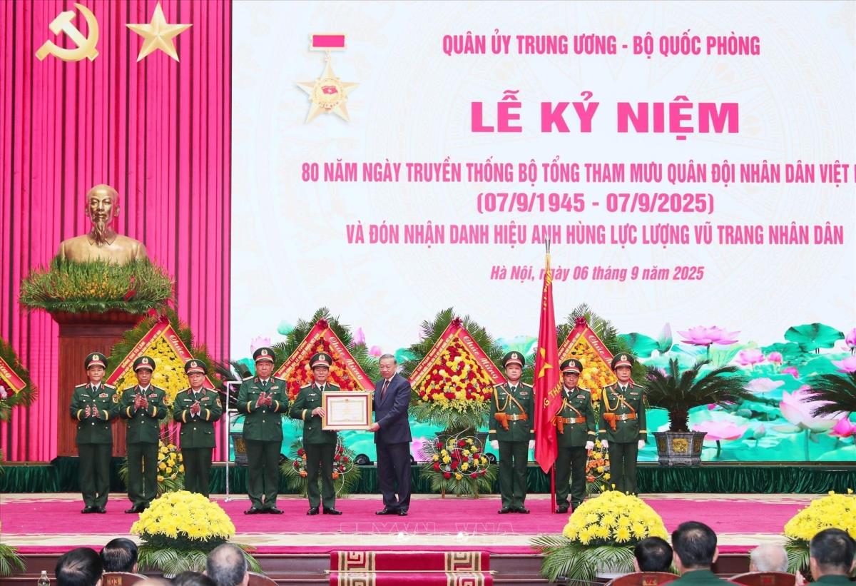 Tổng Bí thư Tô Lâm trao Danh hiệu Anh hùng LLVT nhân dân cho Bộ Tổng Tham mưu QĐND Việt Nam tại lễ kỷ niệm (6/9/2025). Ảnh: Trọng Đức - TTXVN
