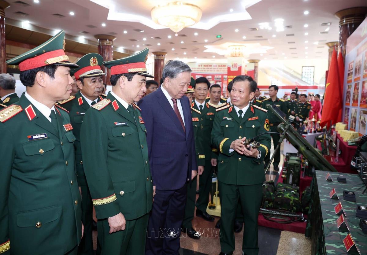 Tổng Bí thư Tô Lâm và các đại biểu tham quan Khu trưng bày sản phẩm công nghiệp Quốc phòng. Ảnh: Trọng Đức - TTXVN