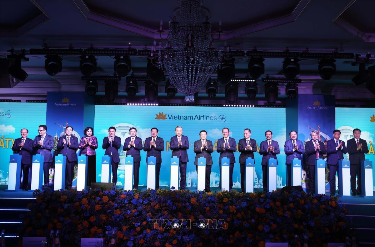 Tổng Bí thư Tô Lâm và các đại biểu thực hiện nghi thức công bố đường bay thẳng Hà Nội -Moskva của hãng hàng không Vietnam Airlines (9/5/2025) . Ảnh: Thống Nhất – TTXVN