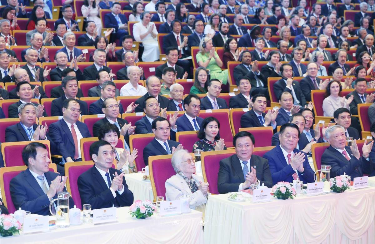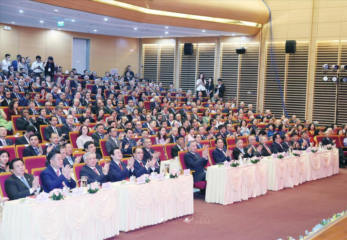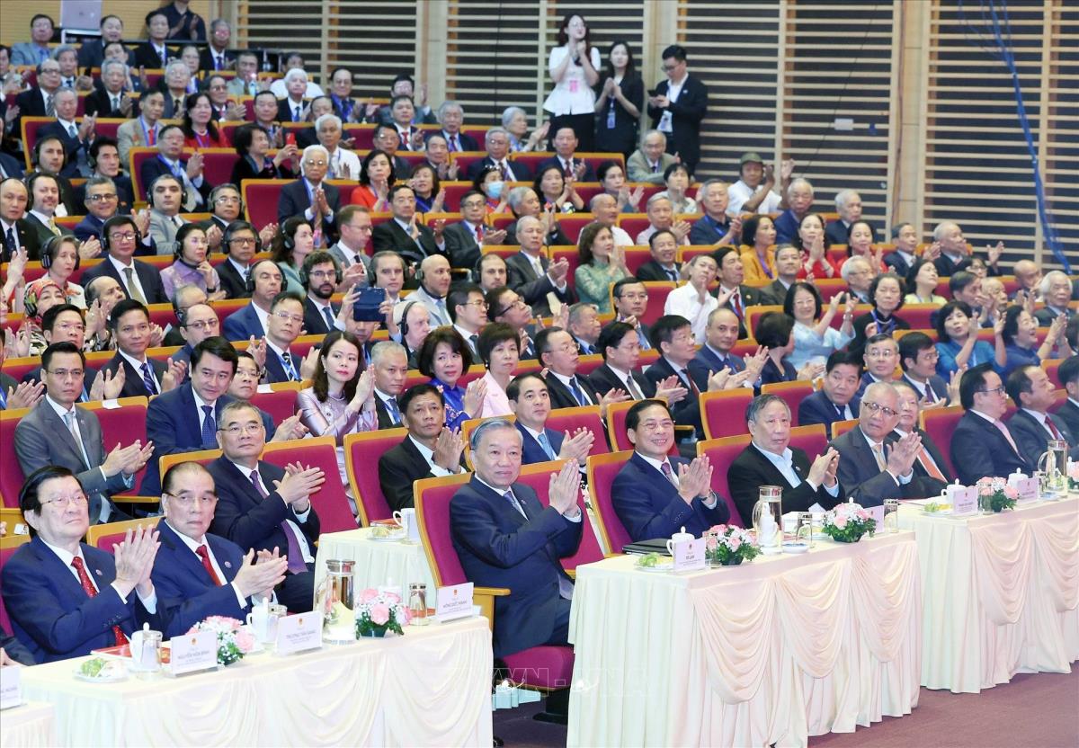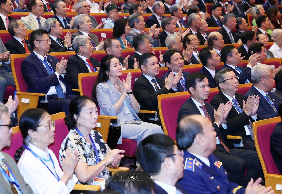 Tổng Bí thư Tô Lâm, các đồng chí lãnh đạo, nguyên lãnh đạo Đảng Nhà nước và các đại biểu dự Lễ kỷ niệm 80 năm Ngày truyền thống ngành Ngoại giao Việt Nam (25/8/2025). Ảnh: Thống Nhất - TTXVN