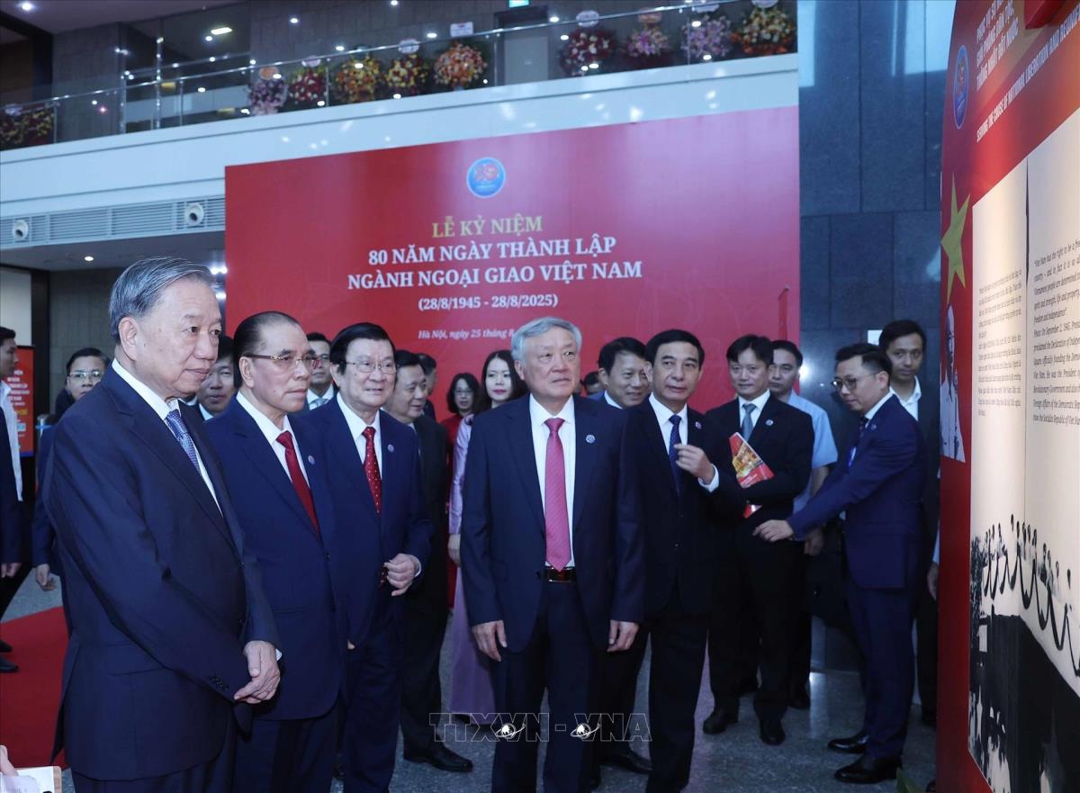 Hà Nội (TTXVN 25/8/2025) Ngày 25/8/2025, tại Hà Nội, Tổng Bí thư Tô Lâm và các đồng chí lãnh đạo, nguyên lãnh đạo Đảng và Nhà nước đến dự Lễ kỷ niệm 80 năm Ngày thành lập ngành Ngoại giao (28/8/1945 - 28/8/2025) và đón nhận Huân chương Lao động hạng Nhất.