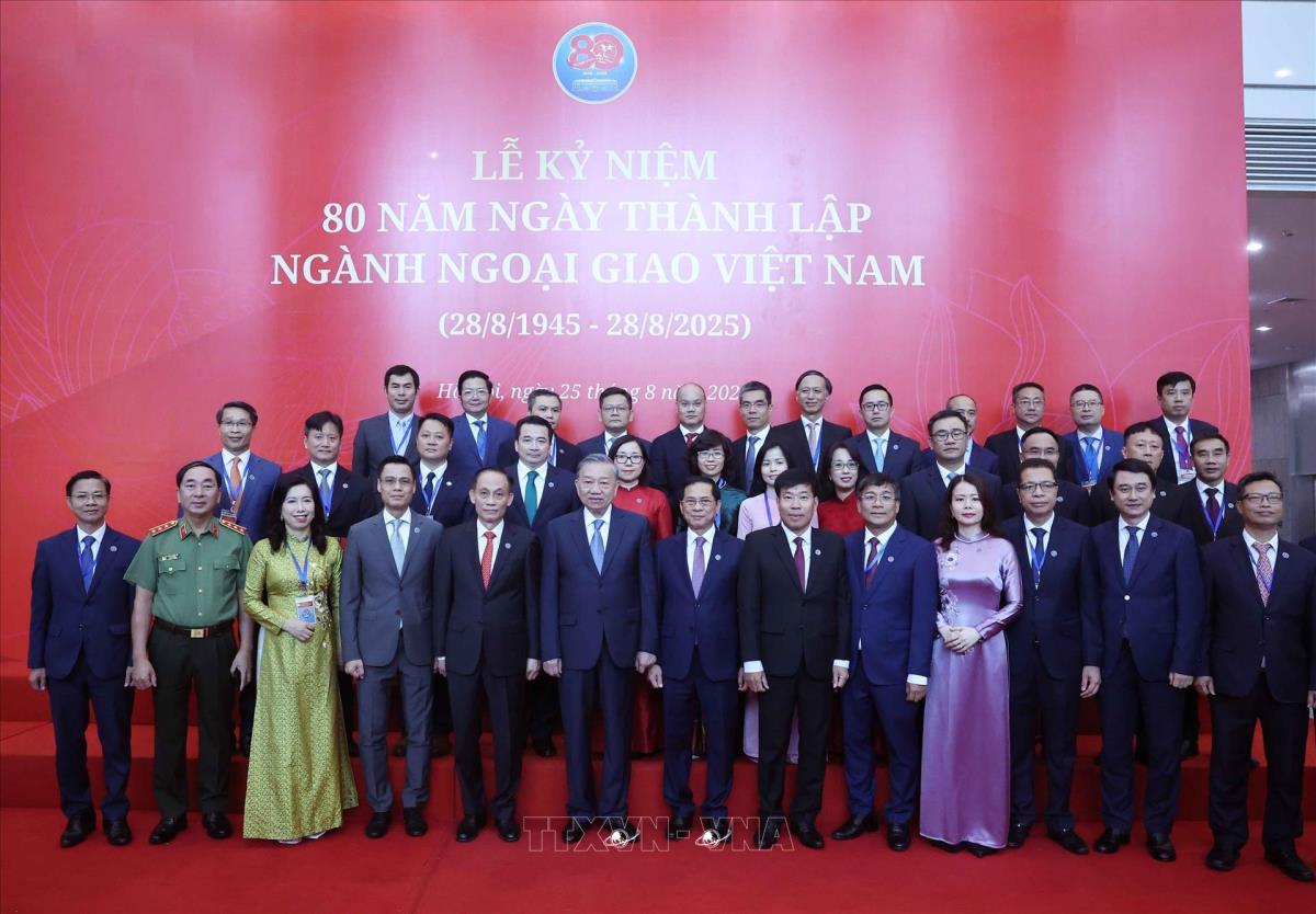 Tổng Bí thư Tô Lâm, các đồng chí lãnh đạo, nguyên lãnh đạo Đảng Nhà nước và các đại biểu dự Lễ kỷ niệm 80 năm Ngày truyền thống ngành Ngoại giao Việt Nam (25/8/2025). Ảnh: Thống Nhất -TTXVN