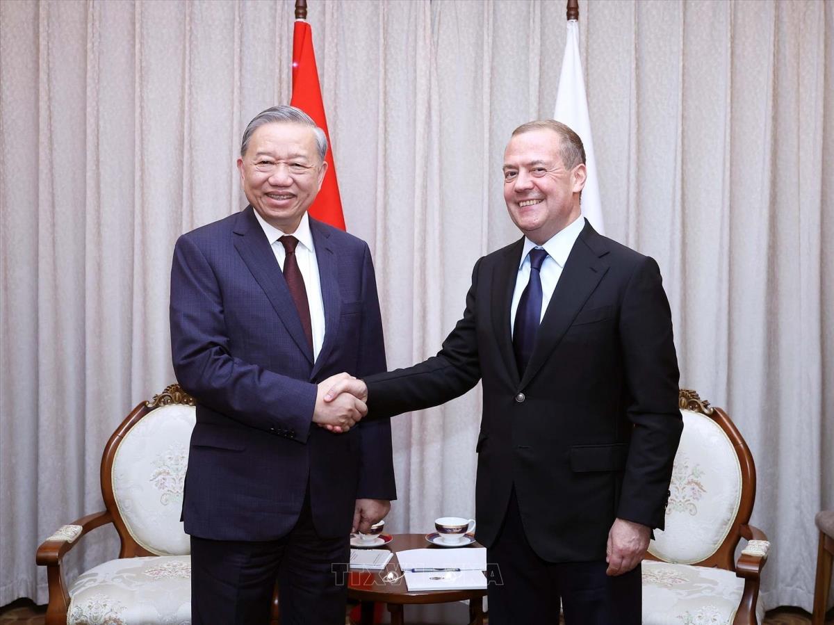 Tổng Bí thư Tô Lâm gặp Chủ tịch Đảng Nước Nga Thống nhất, Phó chủ tịch Hội đồng An ninh Liên bang Nga Dmitry Medvedev (10/10/2025). Ảnh: Thống Nhất - TTXVN