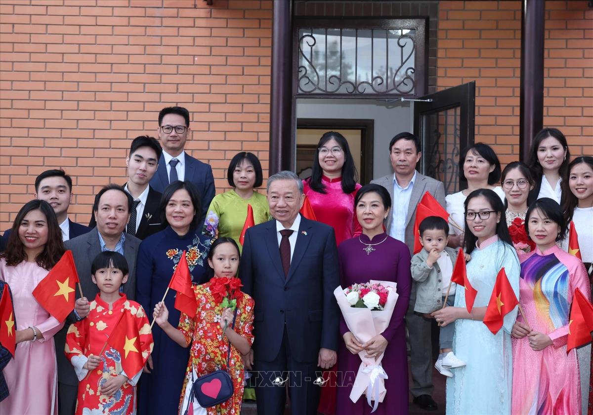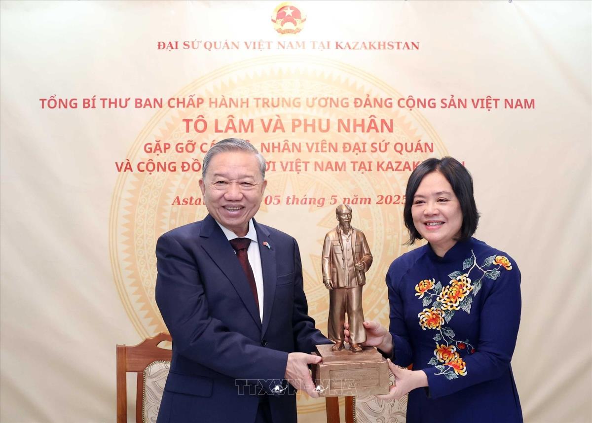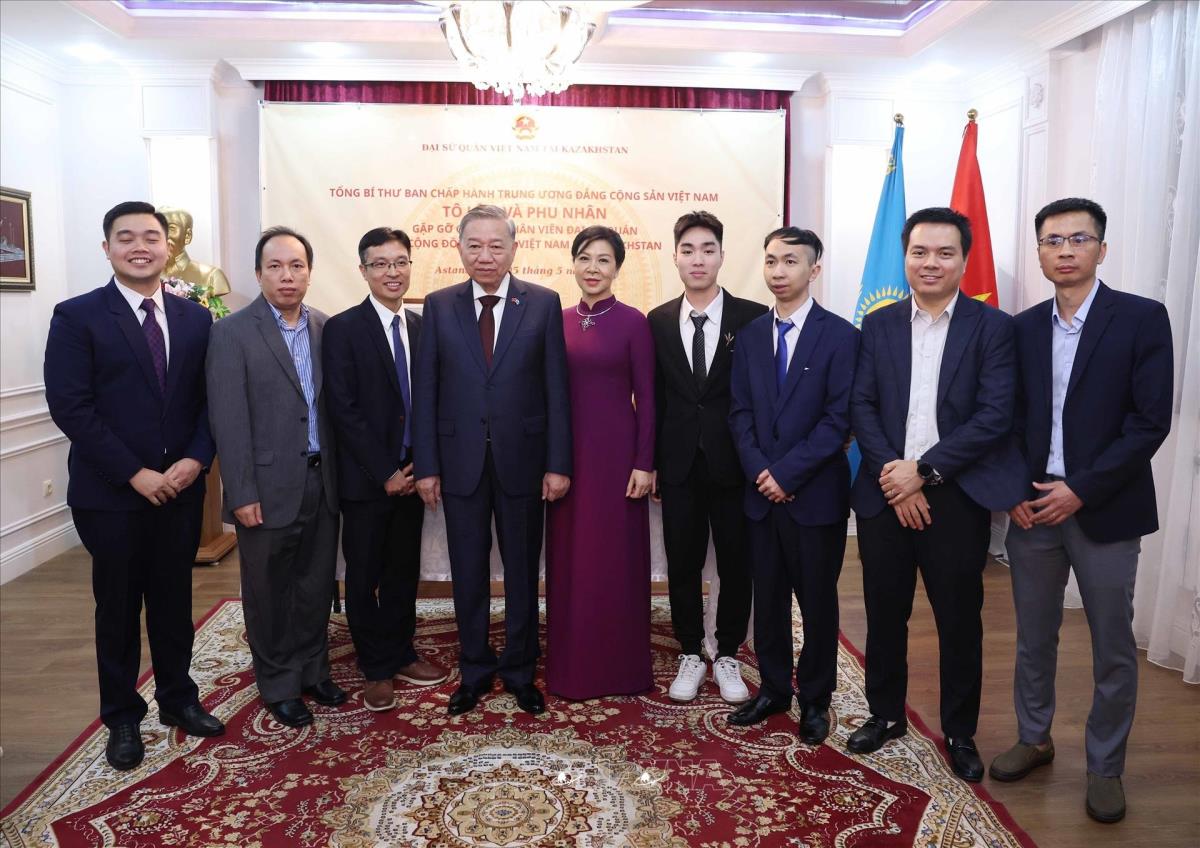 Hà Nội (TTXVN 5/5/2025) Trong khuôn khổ chuyến thăm cấp Nhà nước tới Kazakhstan, tối 5/5/2025, tại thủ đô Astana, Tổng Bí thư Tô Lâm và Phu nhân gặp gỡ cán bộ, nhân viên Đại sứ quán và đại diện cộng đồng người Việt Nam đang sinh sống, học tập và làm việc tại Kazakhstan.