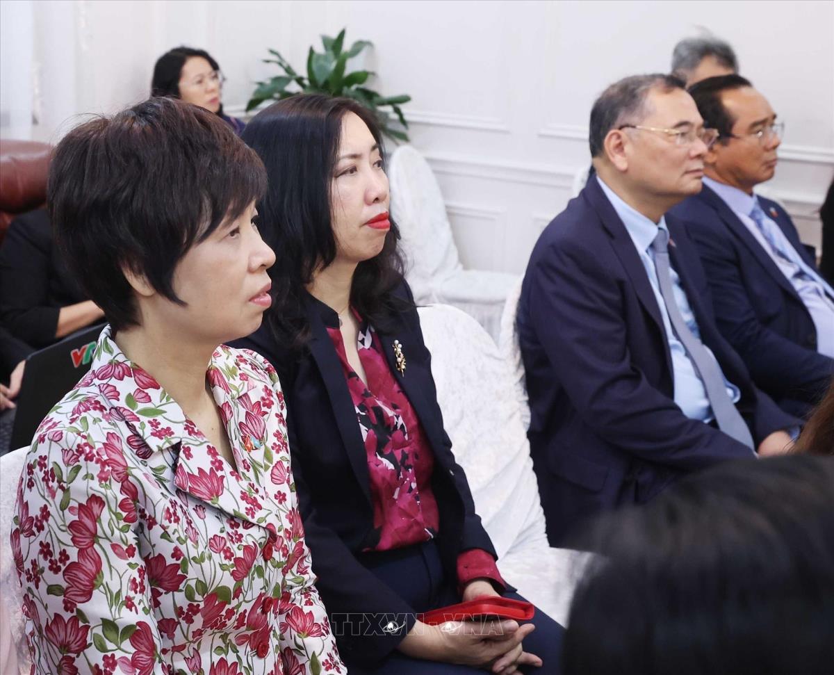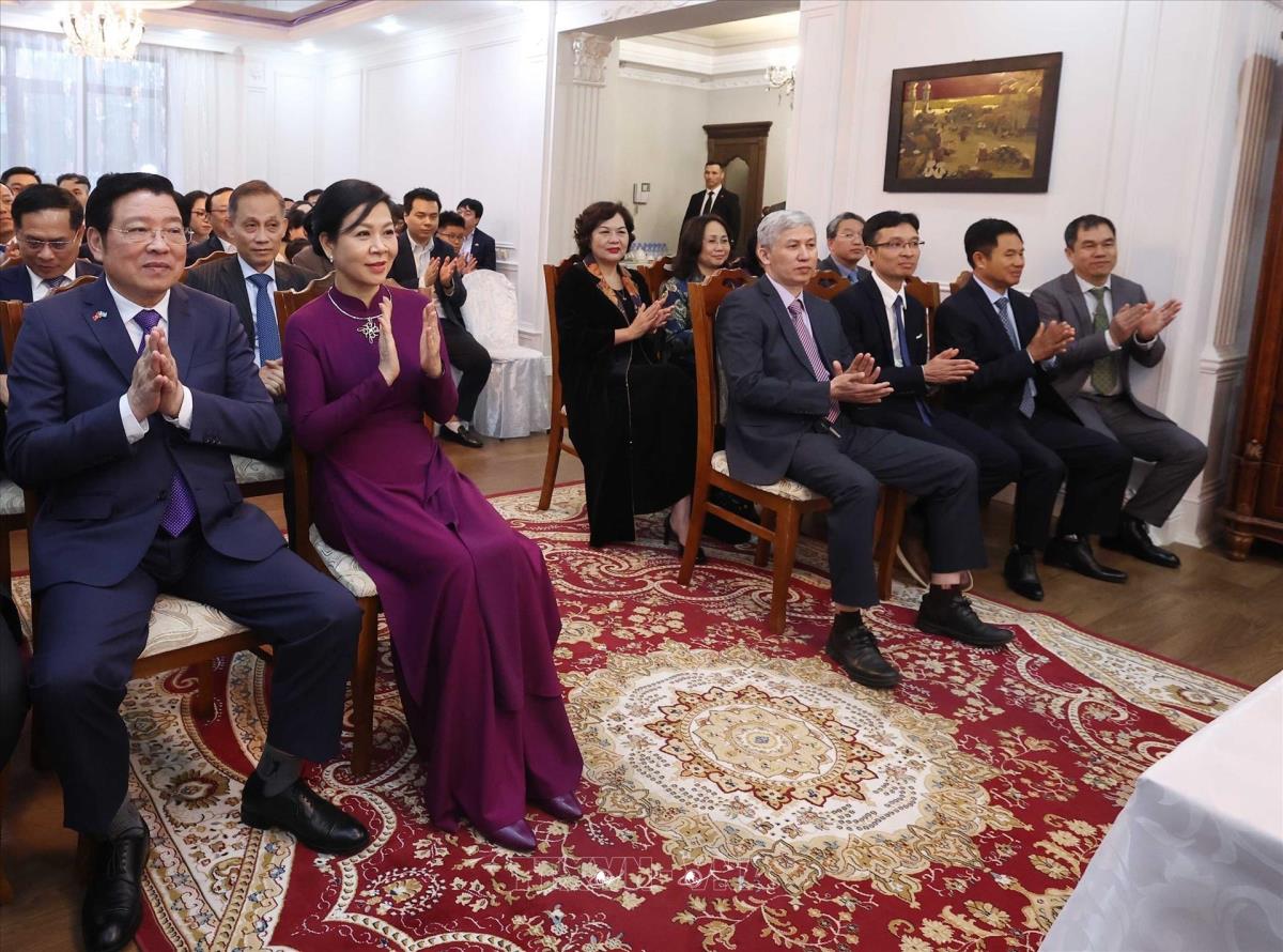 Phu nhân Tổng Bí thư và đại biểu đoàn Việt Nam tham dự buổi gặp gỡ của Tổng Bí thư Tô Lâm với cán bộ Đại sứ quán và cộng đồng người Việt Nam tại Kazakhstan (5/5/2025). Ảnh: Thống Nhất –TTXVN