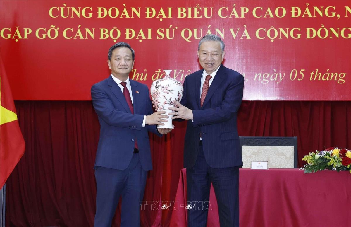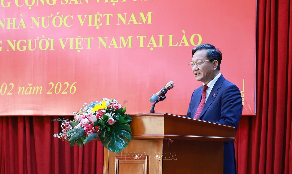 Hà Nội (TTXVN 5/2/20026) Nhân chuyến thăm cấp Nhà nước tới Cộng hòa Dân chủ Nhân dân Lào, chiều 5/2/2026, tại Thủ đô Vientiane, Tổng Bí thư Tô Lâm cùng Đoàn đại biểu cấp cao Đảng, Nhà nước Việt Nam gặp gỡ cán bộ, nhân viên Đại sứ quán và cộng đồng người Việt Nam tại Lào.