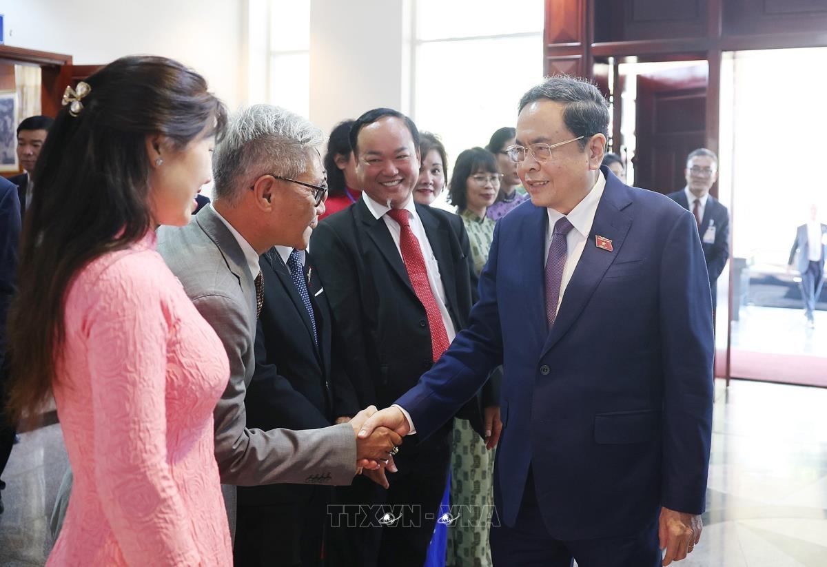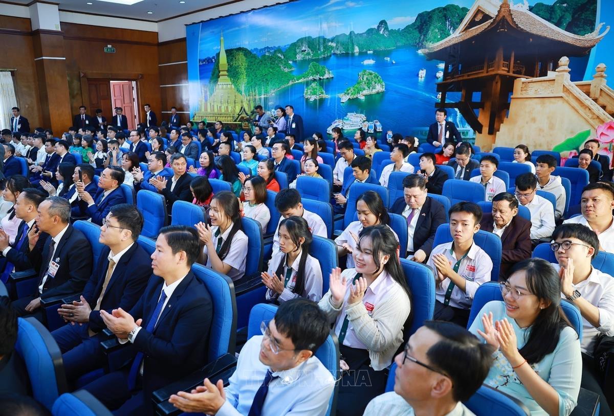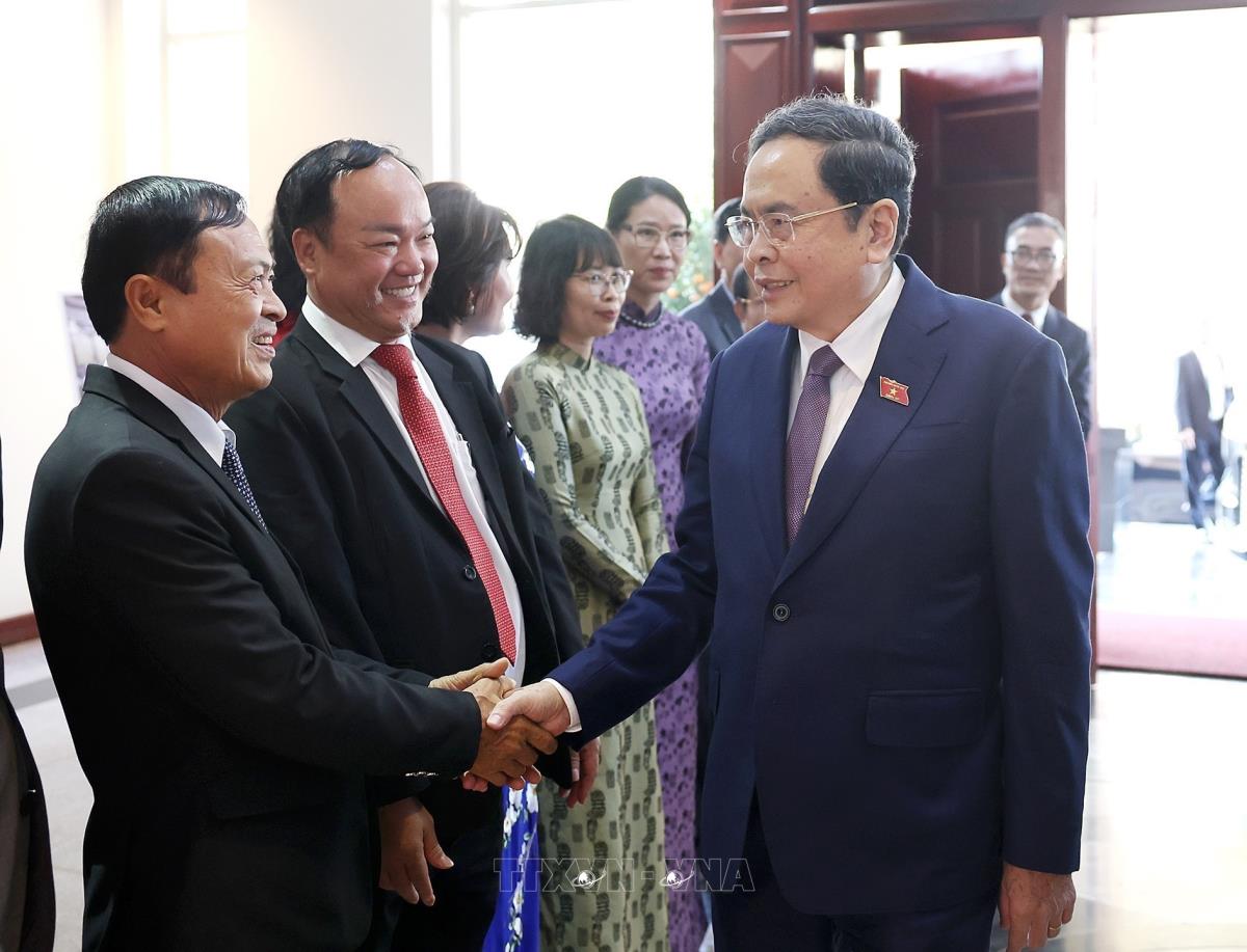 Thủ tướng Phạm Minh Chính và Chủ tịch Quốc hội Trần Thanh Mẫn cùng Đoàn đại biểu cấp cao Đảng, Nhà nước Việt Nam tham dự buổi gặp mặt. Ảnh: Dương Giang - TTXVN
