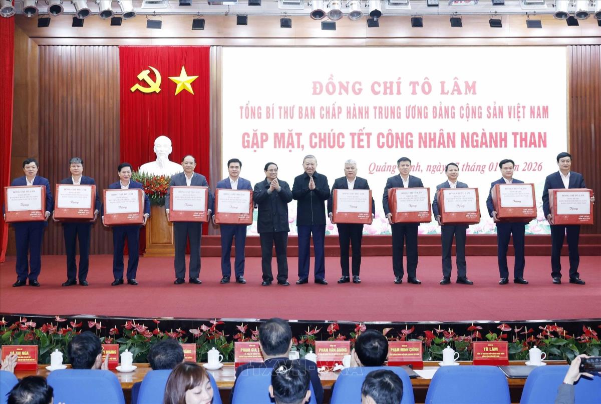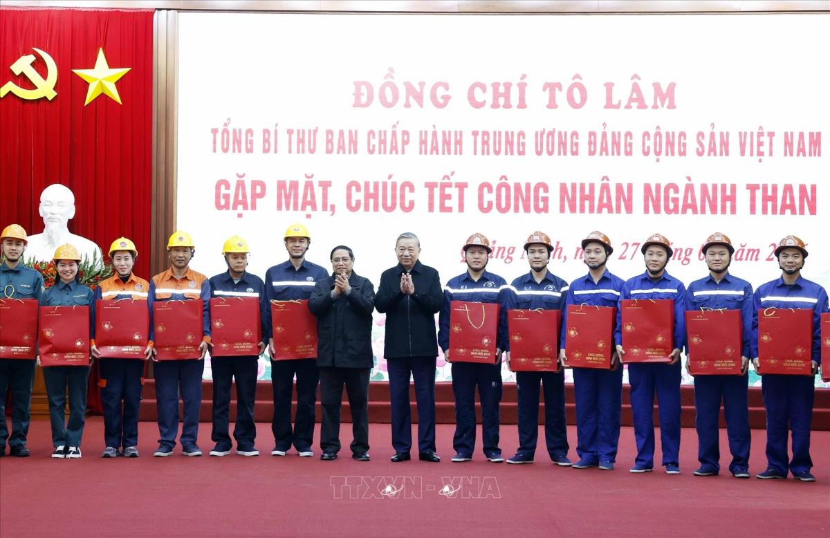Tổng Bí thư Tô Lâm, Thủ tướng Phạm Minh Chính thăm, chúc Tết, tặng quà cán bộ, công nhân trực tiếp sản xuất tại Công ty Cổ phần Than Đèo Nai – Cọc Sáu, Tập đoàn Công nghiệp Than và Khoáng sản Việt Nam, tại tỉnh Quảng Ninh (27/1/2026). Ảnh: Thống Nhất -TTXVN