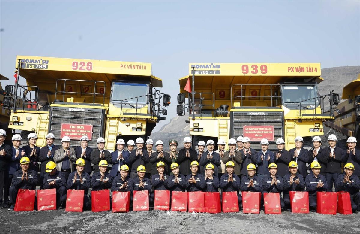 Tổng Bí thư Tô Lâm, Thủ tướng Phạm Minh Chính thăm, chúc Tết cán bộ, công nhân trực tiếp sản xuất tại Công ty Cổ phần Than Đèo Nai – Cọc Sáu, Tập đoàn Công nghiệp Than và Khoáng sản Việt Nam, tại tỉnh Quảng Ninh (27/1/2026). Ảnh: Thống Nhất -TTXVN
