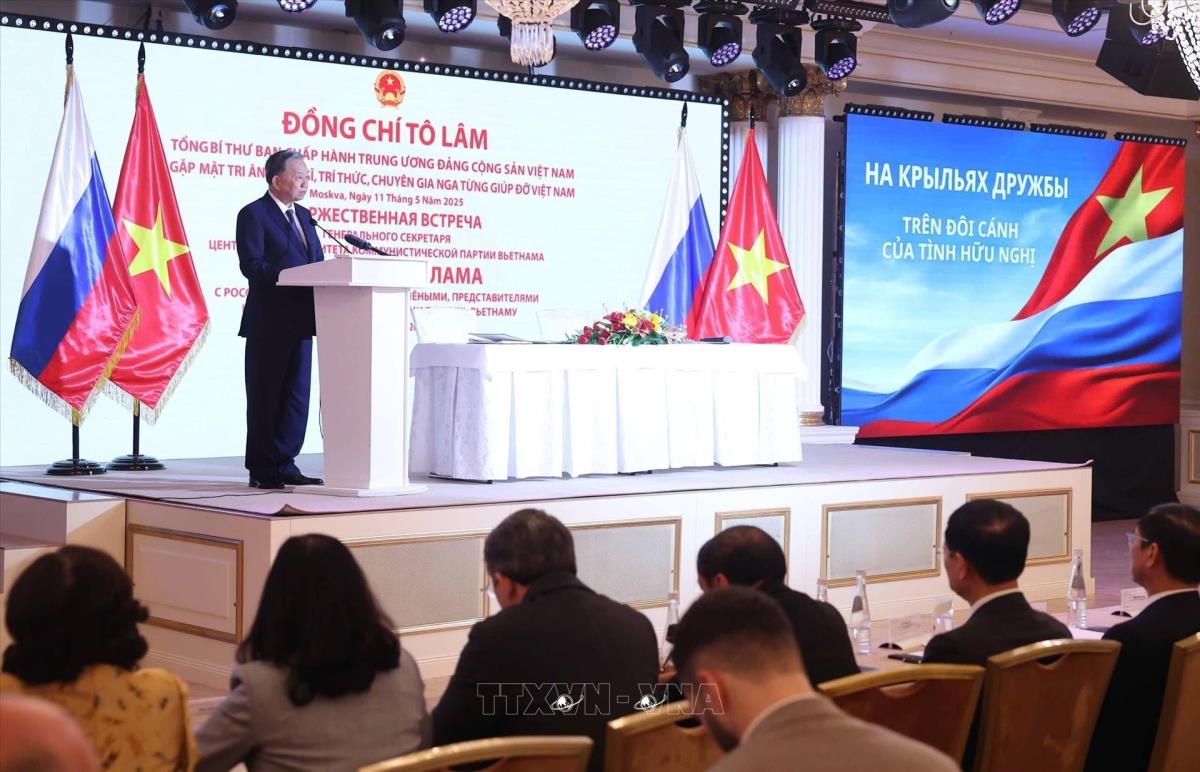 Tổng Bí thư Tô Lâm phát biểu tại buổi gặp mặt tri ân nhân sĩ, trí thức, chuyên gia Nga từng giúp đỡ Việt Nam (11/5/2025). Ảnh: Thống Nhất – TTXVN