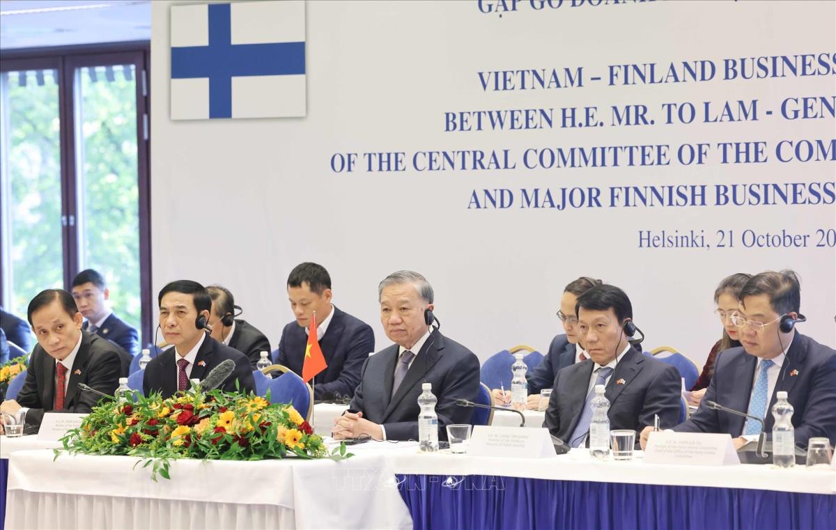 Hà Nội (TTXVN 21/10/2025) Tiếp tục hoạt động trong chuyến thăm chính thức Phần Lan, chiều 21/10/2025 (giờ địa phương), tại thủ đô Helsinki, Tổng Bí thư Tô Lâm gặp một số doanh nghiệp tiêu biểu của Phần Lan.