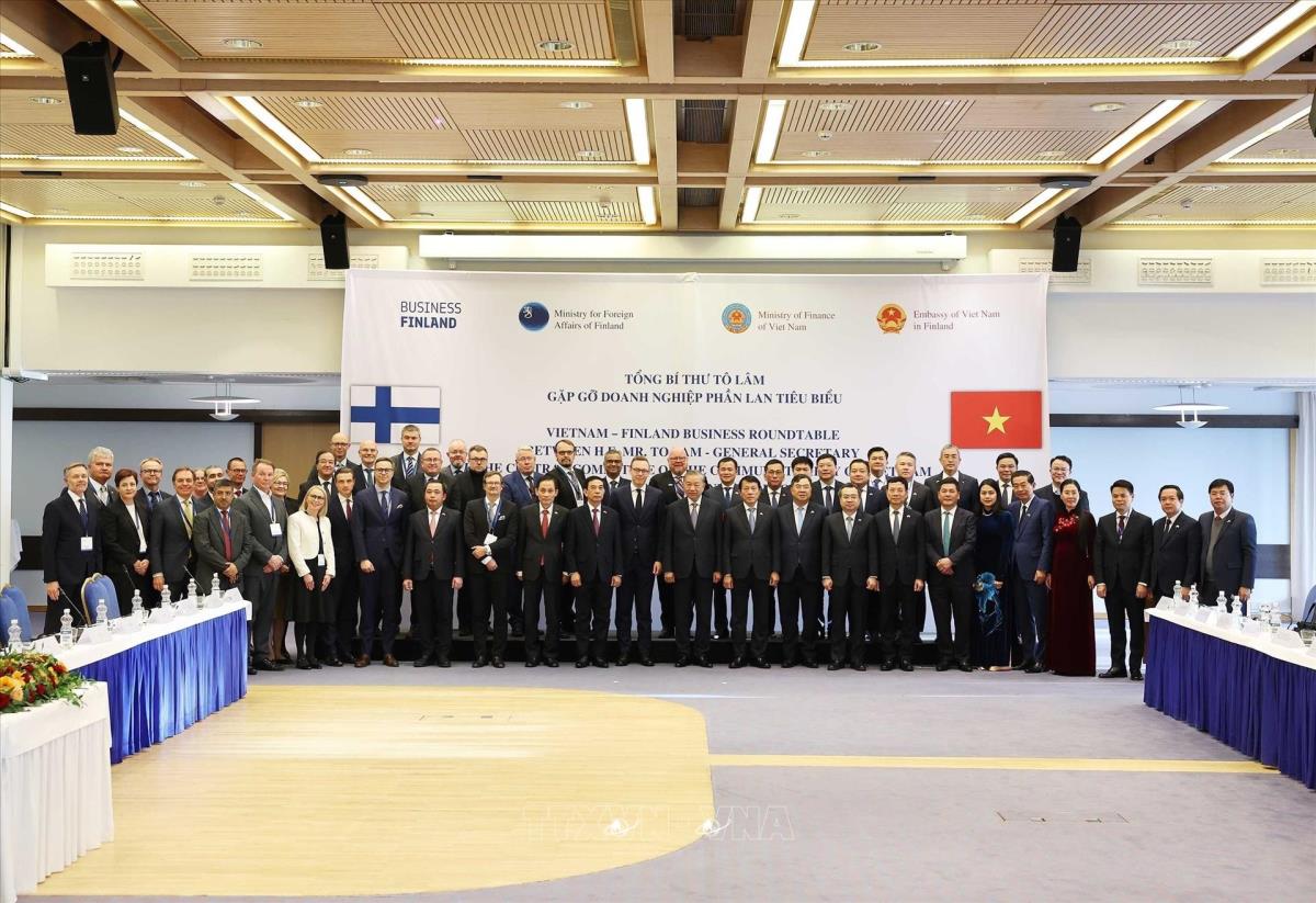 Tổng Bí thư Tô Lâm gặp một số doanh nghiệp tiêu biểu của Phần Lan tại thủ đô Helsinki (21/10/2025). Ảnh: Thống Nhất – TTXVN
