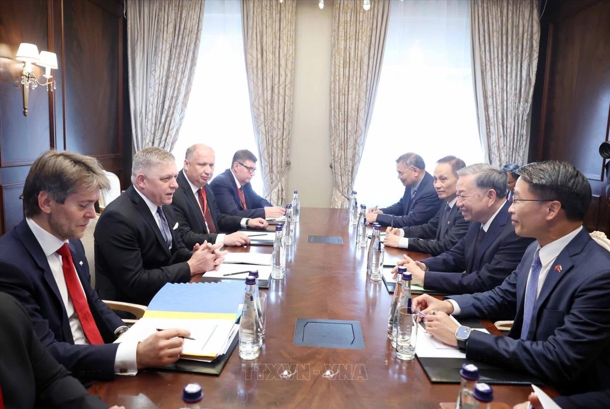 Hà Nội (TTXVN 9/5/2025) Chiều 9/5/2025, giờ địa phương (tối cùng ngày, giờ Hà Nội), tại thủ đô Moskva, Tổng Bí thư Tô Lâm gặp Thủ tướng Slovakia Robert Fico.