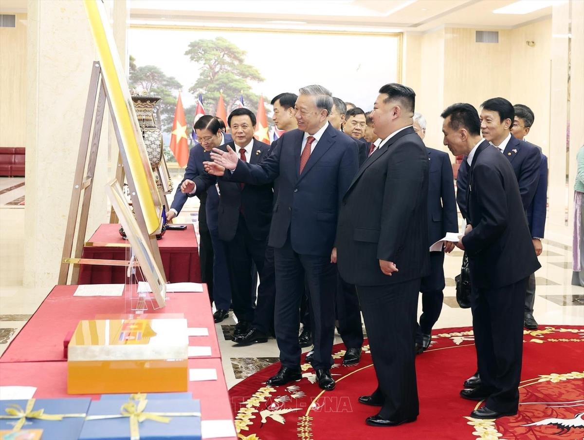 Sau khi kết thúc hội đàm, Tổng Bí thư Tô Lâm trao tặng Tổng Bí thư, Chủ tịch Quốc vụ CHDCND Triều Tiên Kim Jong Un cuốn sách ảnh "Thắm tình hữu nghị Việt Nam - Triều Tiên" (9/10/2025). Ảnh: Thống Nhất – TTXVN