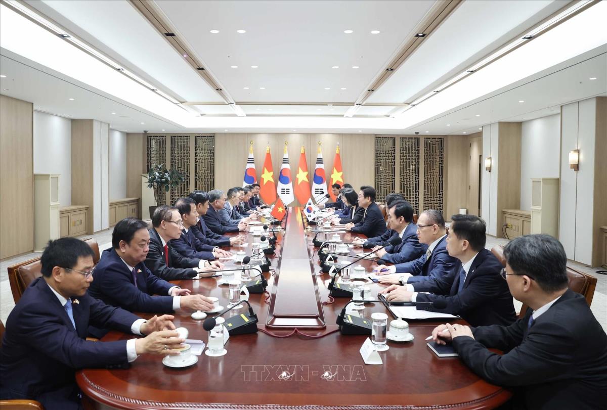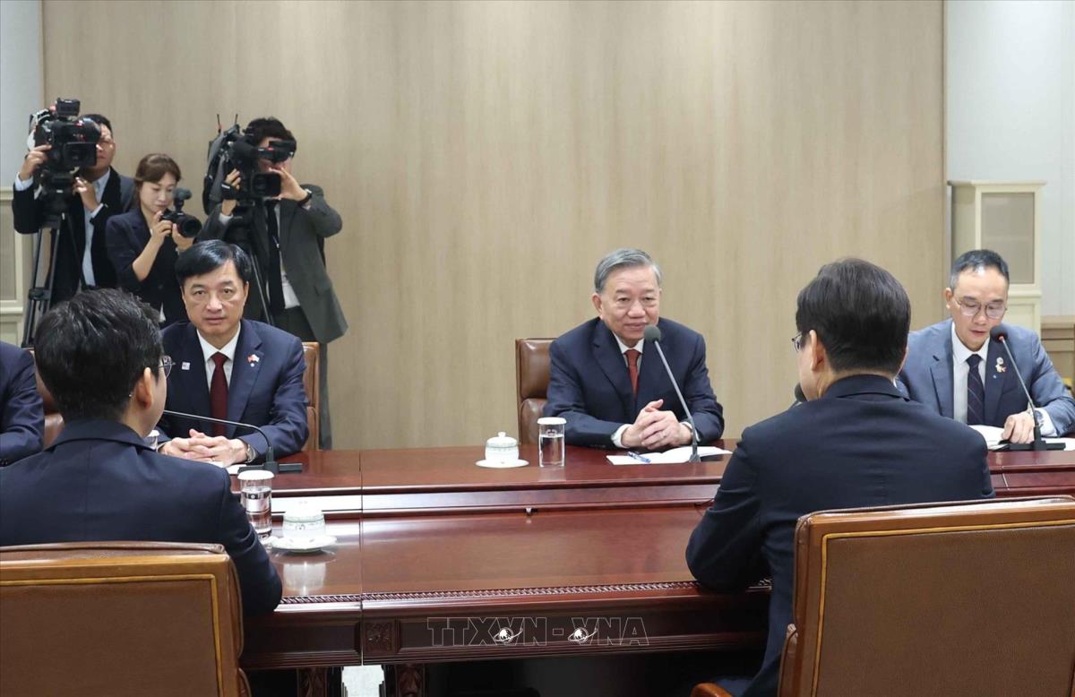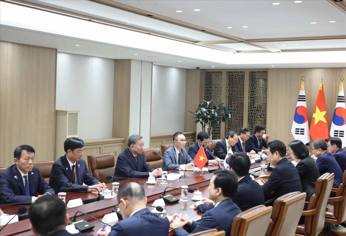 Hà Nội (TTXVN 11/8/2025) Sáng 11/8/2025, ngay sau lễ đón cấp Nhà nước tại Phủ Tổng thống ở Thủ đô Seoul, Tổng Bí thư Tô Lâm hội đàm với Tổng thống Hàn Quốc Lee Jae Myung.